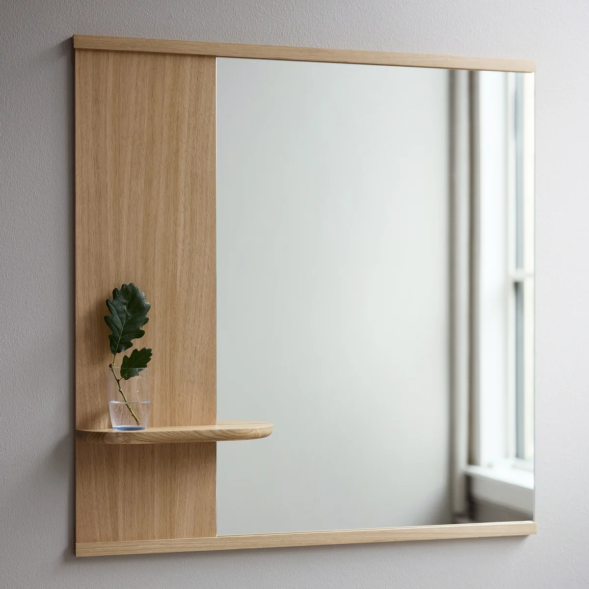 Ein funktionales und elegantes Design vereint Spiegel und Regal in einem vielseitigen Möbelstück aus Eiche und Glas. Perfekt für moderne Innenräume, lässt es sich flexibel anpassen und ist ideal für feuchte Umgebungen wie Badezimmer geeignet.