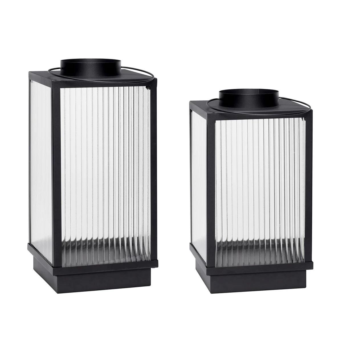 Die Laterne von Hübsch Interior ist ein wunderschöner Lichtspender, der vor allem auf dem Balkon, der Terrasse und dem Garten stilvolle Akzente setzt. Das Design ist klassisch und zeitlos: In der quadratischen Laterne finden auch große Kerzen Platz, die vom geriffelten Glas auf wunderschöne Weise reflektiert werden. Der Rahmen besteht aus schlankem, schwarzen Stahl, was die Laterne in jedes Ambiente integriert.