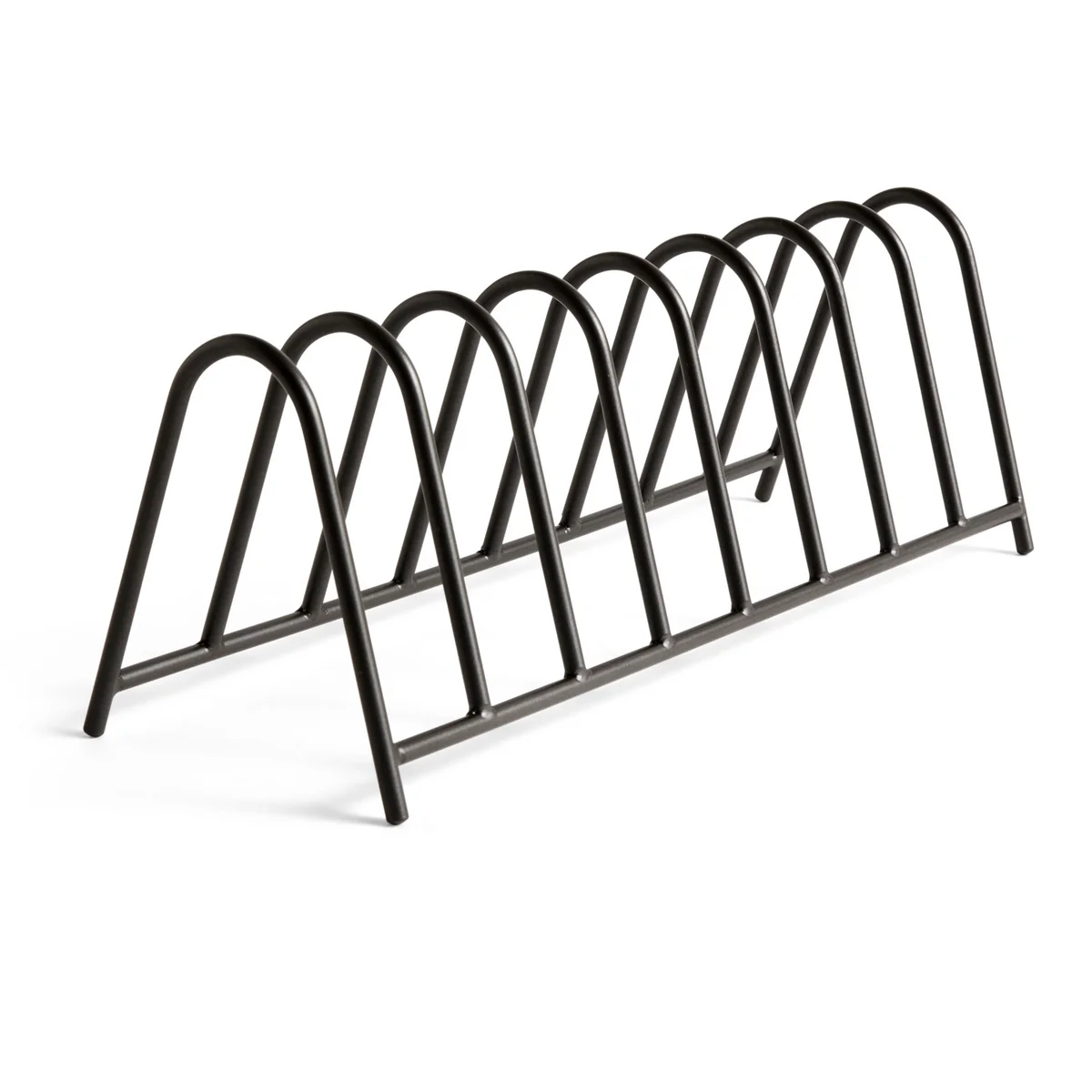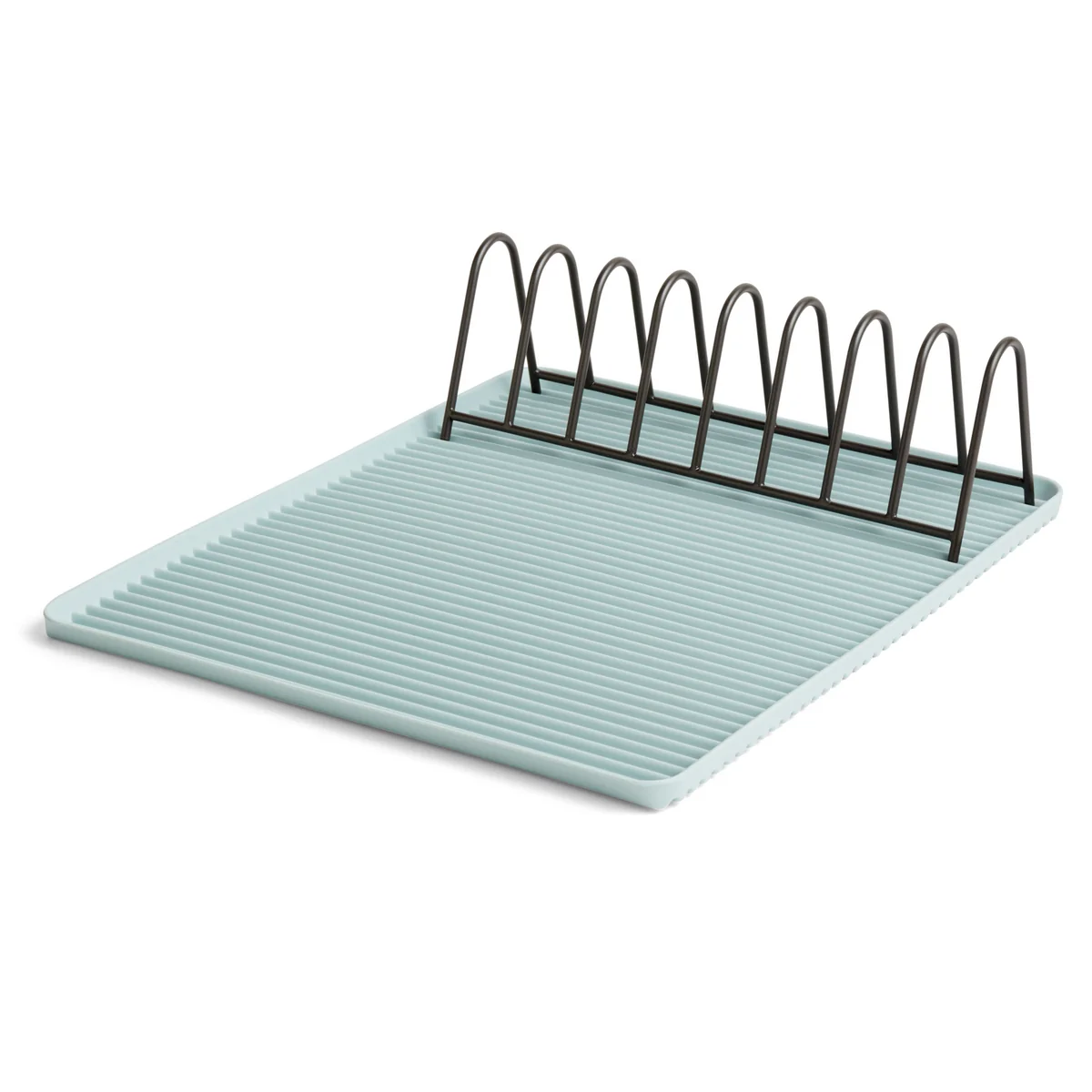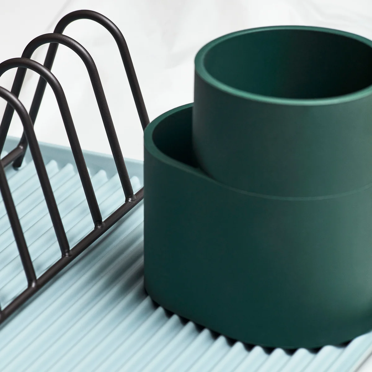 Bei dem Dish Drainer von HAY handelt es sich um ein Abtropfgestell für die Küche, das sich ganz nach den eigenen Bedürfnissen konfigurieren lässt. Abtropftablett, Gestell und Abtropfbehälter sind einzeln erhältlich und können je nach Belieben miteinander kombiniert werden. Die Basis aus Melamin besitzt eine geriffelte Struktur, sodass anfallendes Wasser leicht abfließen kann und sich keine Pfützen bildet. Auf dem Tablett können nun mehrere Gestelle arrangiert werden, die zum aufrechten Trocknen von min. 8 Tellern, Schalen oder Pfannen dienen. Soll zudem auch das Besteck einen Platz zum Abtropfen bekommen, so ist auch ein Behälter aus Silikon erhältlich, der an gewünschter Stelle auf dem Tablett platziert werden kann.