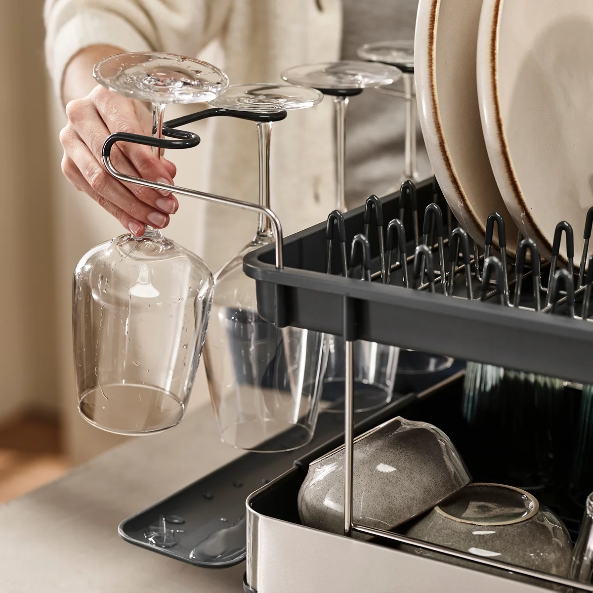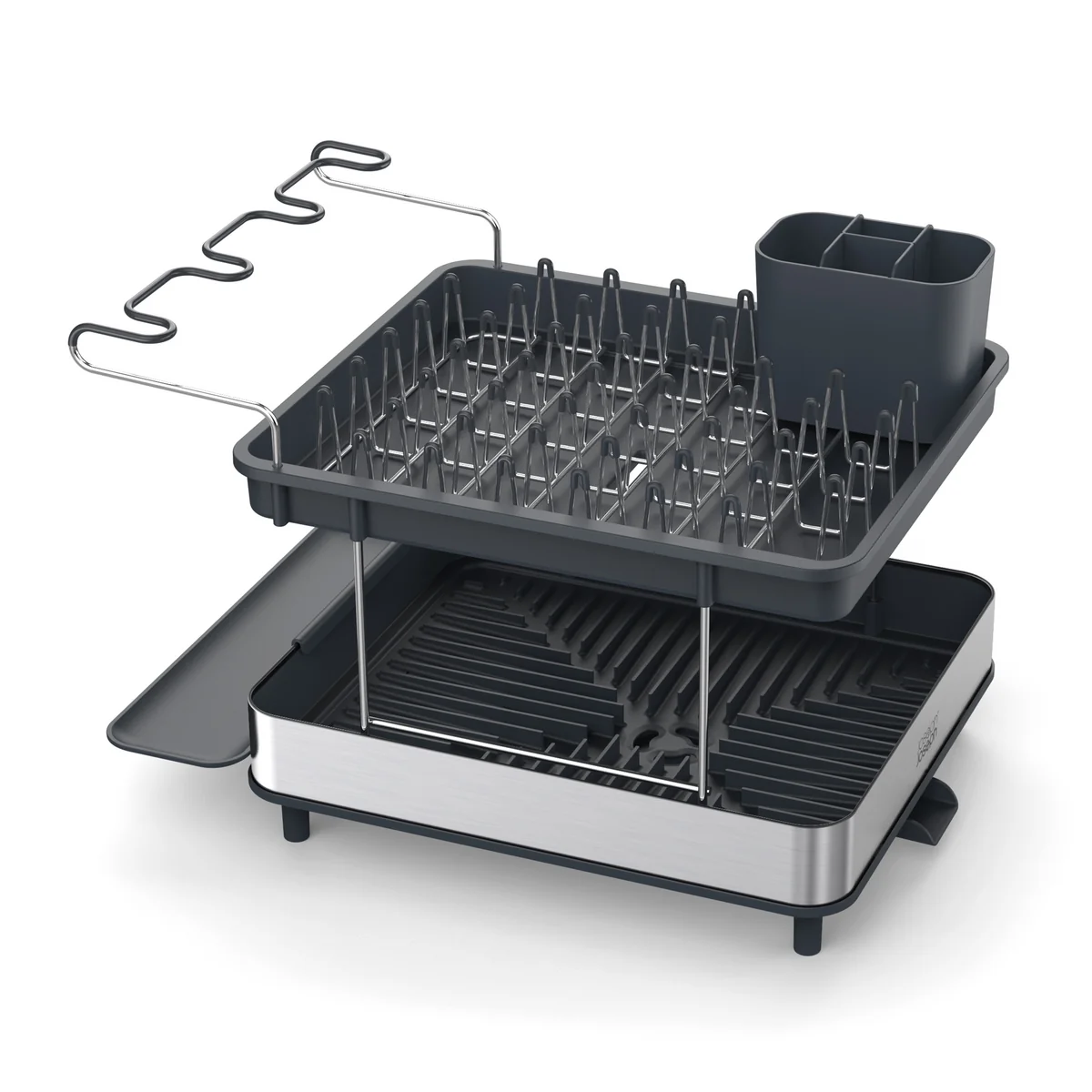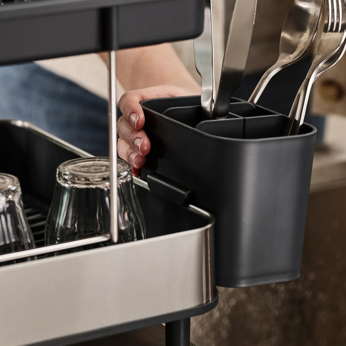 Das Excel Steel 2-stufiges Edelstahl-Abtropfgestell von Joseph Joseph bietet die optimale Lösung für Platzmangel. Das zweistufige Konstrukt ermöglicht es, dass auf wenig Fläche eine maximale Menge an Geschirr ideal abtropfen kann. Der integrierte Weinglashalter sorgt dafür, dass die Gläser sicher trocknen können. Je nach Wahl kann der bewegliche Besteckhalter innerhalb des Gestells bleiben oder an der Unterseite des Untergestells eingehängt werden, um mehr Platz zu bieten. Überschüssiges Wasser kann so in die Spüle ablaufen.