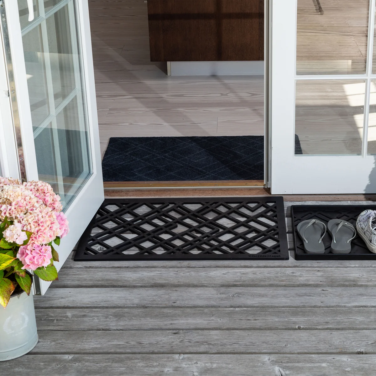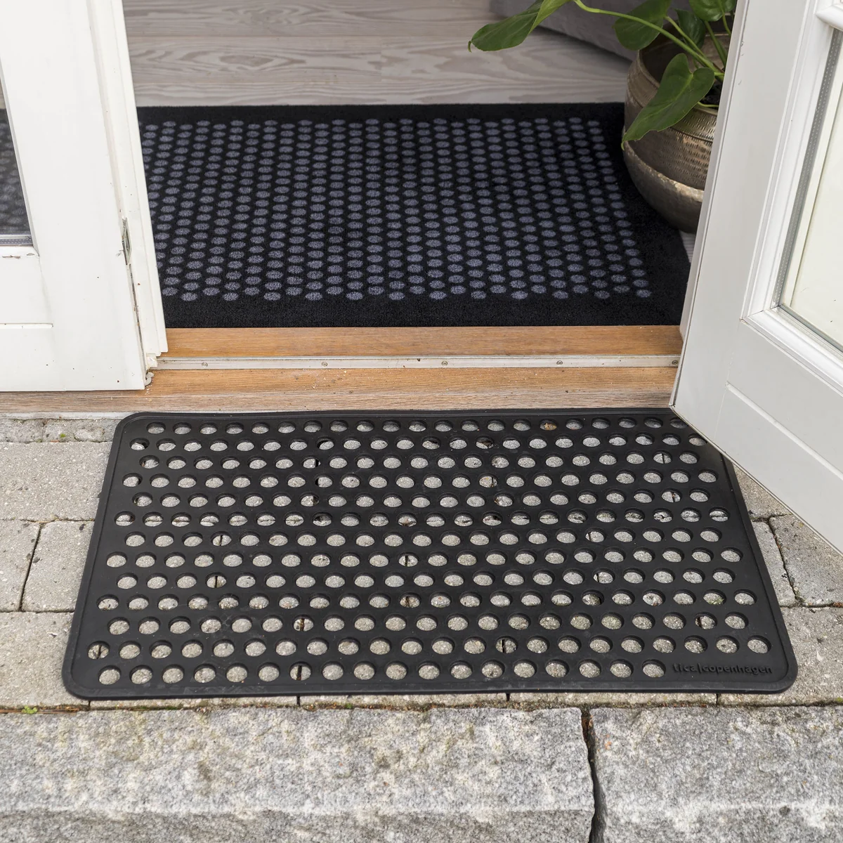Die Gummi-Fußabtreter von tica copenhagen ist die optimale Matte für den Eingangsbereich und vor der Haustür. Die Matte wird aus 60 % recyceltem Gummi hergestellt und ist dadurch recht schwer. Deshalb liegt die Matte sowohl im Innen- als auch im Außenbereich stabil und fest auf dem Boden und verrutscht nicht. Die Matte kann ganzjährig draußen liegen und ist mit einem Staubsauger oder mit Wasser leicht zu reinigen.