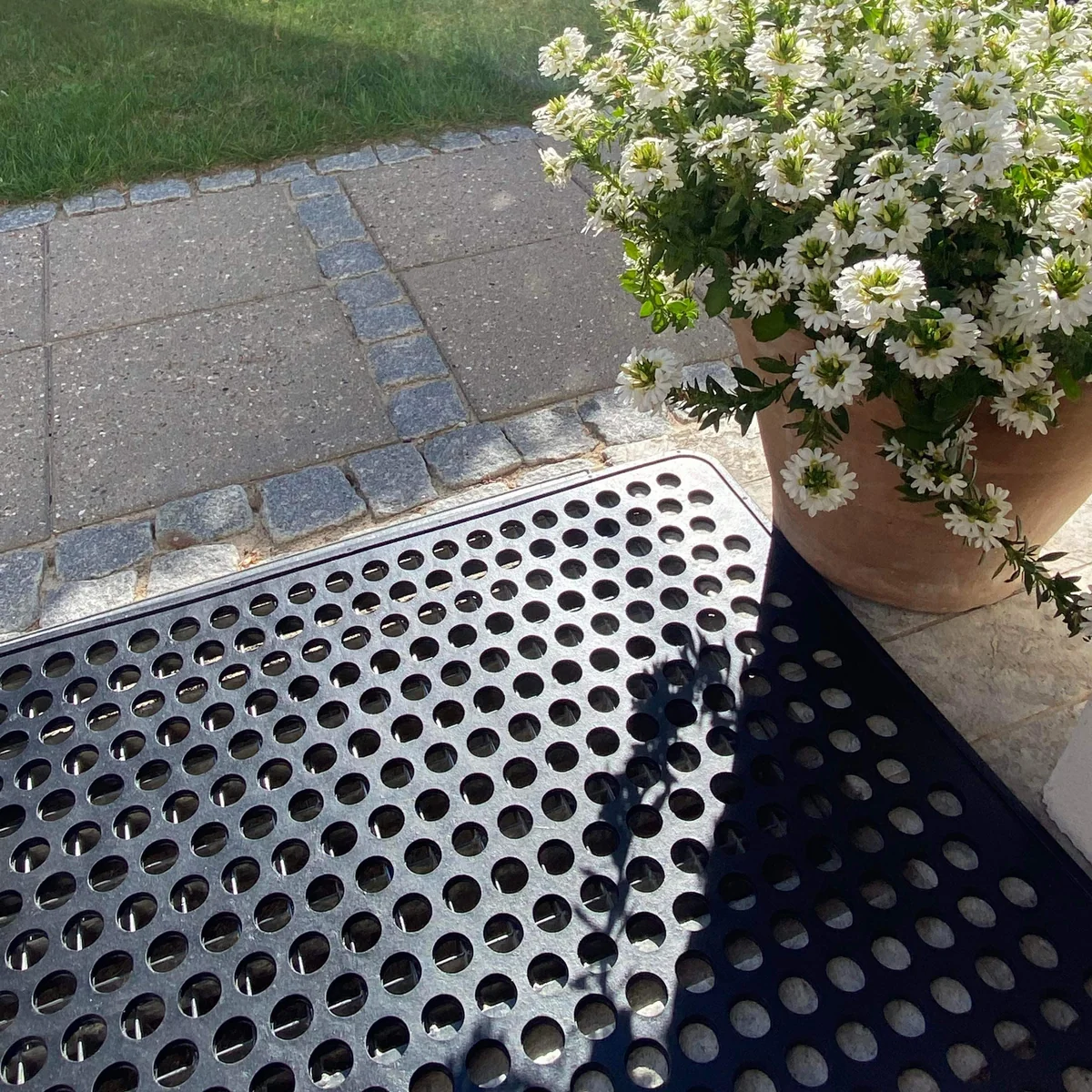 Die Gummi-Fußabtreter von tica copenhagen ist die optimale Matte für den Eingangsbereich und vor der Haustür. Die Matte wird aus 60 % recyceltem Gummi hergestellt und ist dadurch recht schwer. Deshalb liegt die Matte sowohl im Innen- als auch im Außenbereich stabil und fest auf dem Boden und verrutscht nicht. Die Matte kann ganzjährig draußen liegen und ist mit einem Staubsauger oder mit Wasser leicht zu reinigen.