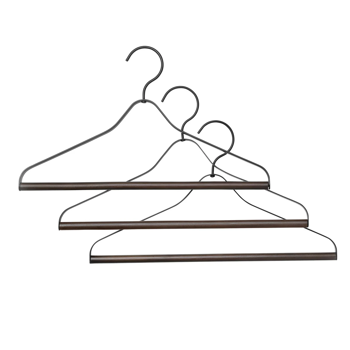 Die hochwertigen Kleiderbügel von Ferm Living kommen im praktischen 3er-Set und bestehen aus einer Kombination aus pulverbeschichtetem Stahl und schwarz gebeiztem Holz. Die Materialien verleihen den Kleiderbügel ein robustes, langlebiges, dezentes und zugleich modernes Aussehen, wodurch sich die Kleiderbügel flexibel einsetzten, lassen. Besonders praktisch ist auch der Querbalken und der drehbaren Haken zum Aufhängen der Kleiderbügel.