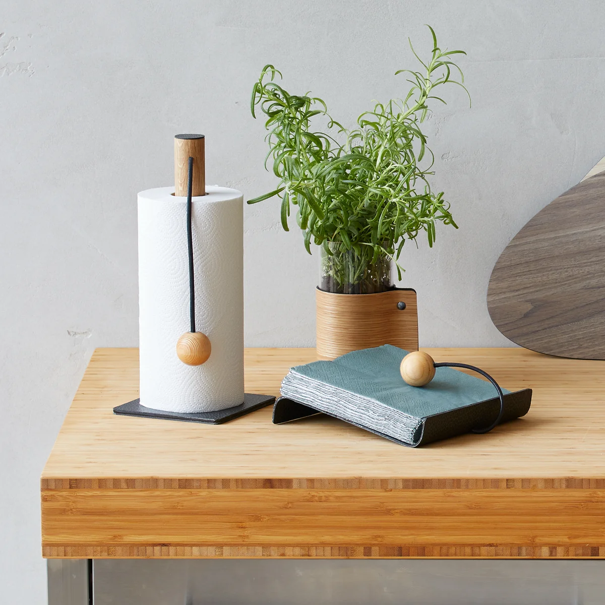 Der String Küchenrollenhalter von Lind DNA überzeugt durch sein dekoratives Aussehen und die verspielte Kugel, welche die Küchenrolle daran hindert, sich abzurollen. Neben dem Herd aber auch auf dem Esstisch ist der Küchenrollenhalter besonders praktisch. Dabei hält die Kugel aus Eichenholz die Rolle an Ort und Stelle.