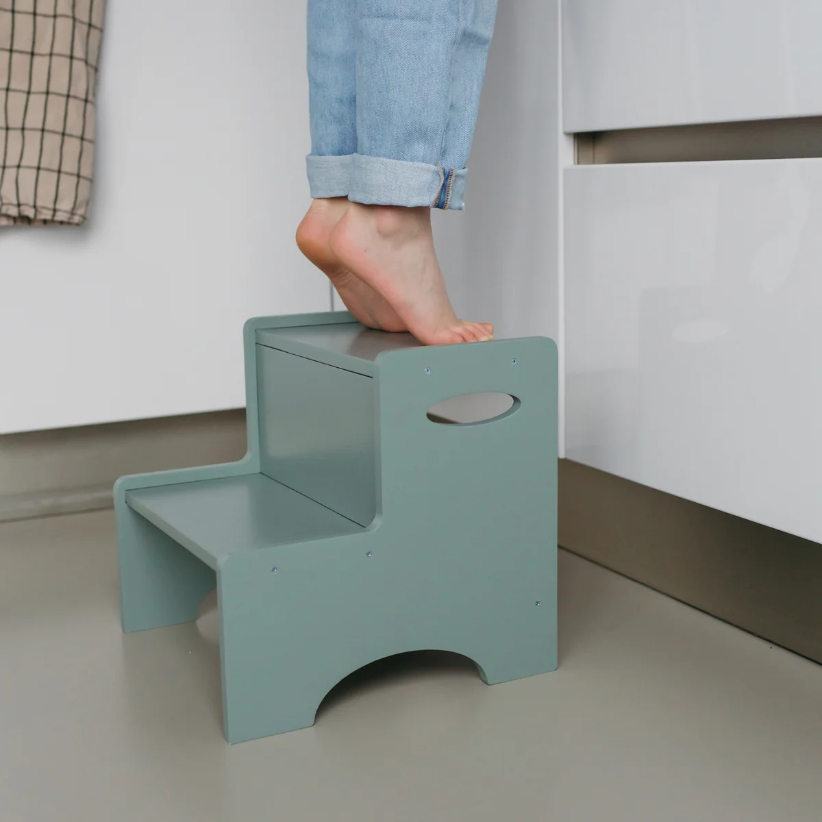 Die Step Up Trittleiter wird aus Pappelholz hergestellt und lässt sich nicht zusammenklappen. Durch ihr Größe lässt sie sich jedoch ideal in Ecken oder beispielsweise in dem Stauraum unter der Spüle in der Küche positionieren.