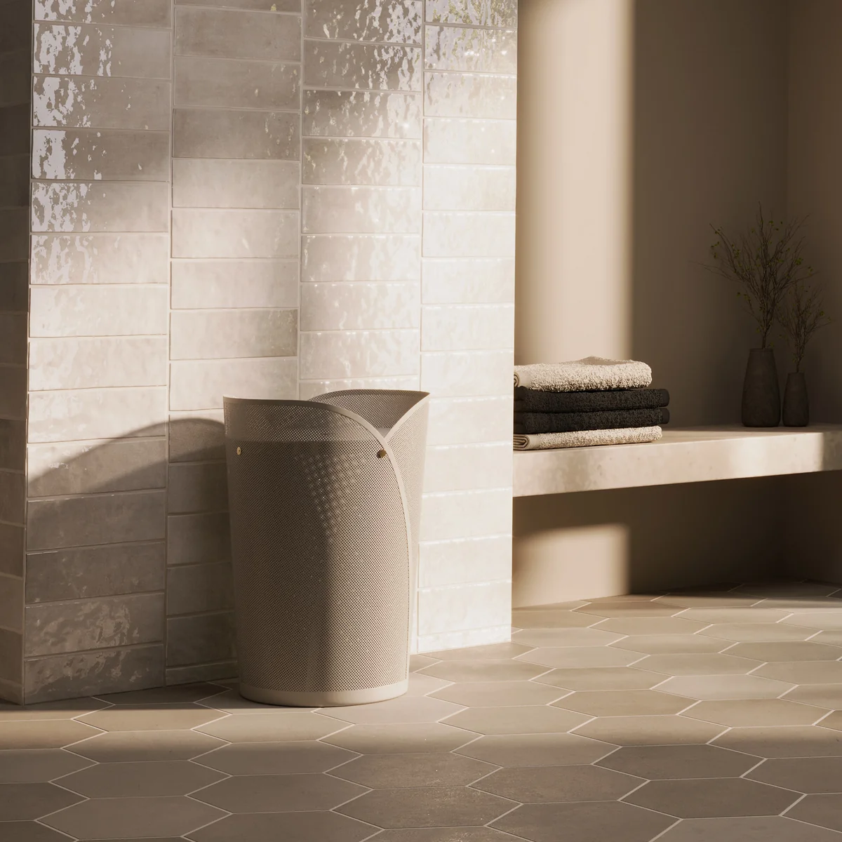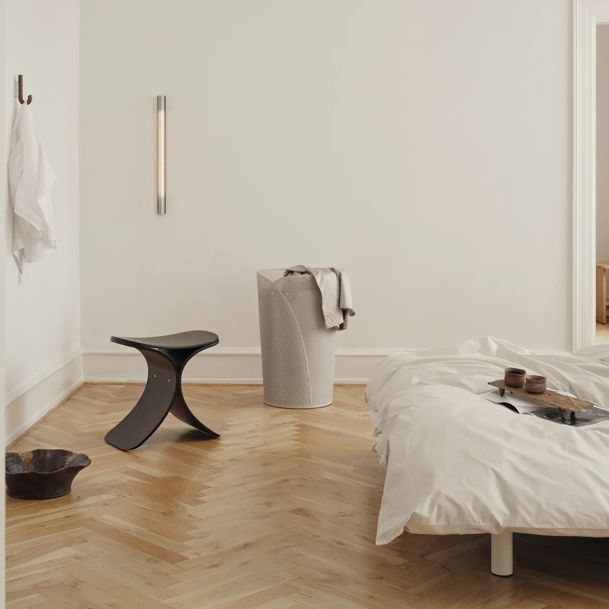 Ob im Schlafzimmer, Flur oder Hauswirtschaftsraum – OYA muss nicht versteckt werden, sondern setzt bewusst einen gestalterischen Akzent. Ein herausnehmbarer Baumwollbeutel mit 75 Litern Fassungsvermögen sorgt für praktische Handhabung im Alltag. Inspiriert von japanischen Begriffen für „umhüllen“ und „verbergen“, vereint das Design sanfte Formen mit klarer Struktur und verleiht dem Wäschekorb eine skulpturale Präsenz.