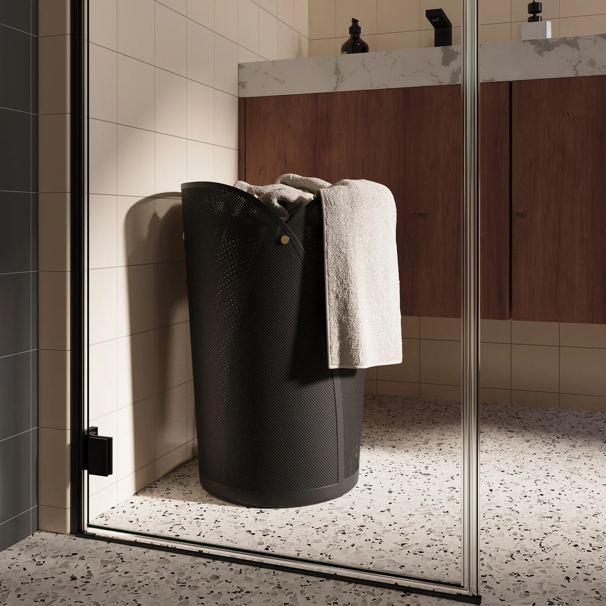 Der OYA Wäschekorb verwandelt einen Alltagsgegenstand in ein stilvolles Designobjekt. In Zusammenarbeit mit dem Søren Rose Studio entworfen, besteht der Wäschekorb aus perforiertem Metall, das durch zwei überlappende Schalen eine elegante, blütenartige Struktur bildet. So entsteht eine besondere Leichtigkeit, die Funktion und Ästhetik harmonisch verbindet.