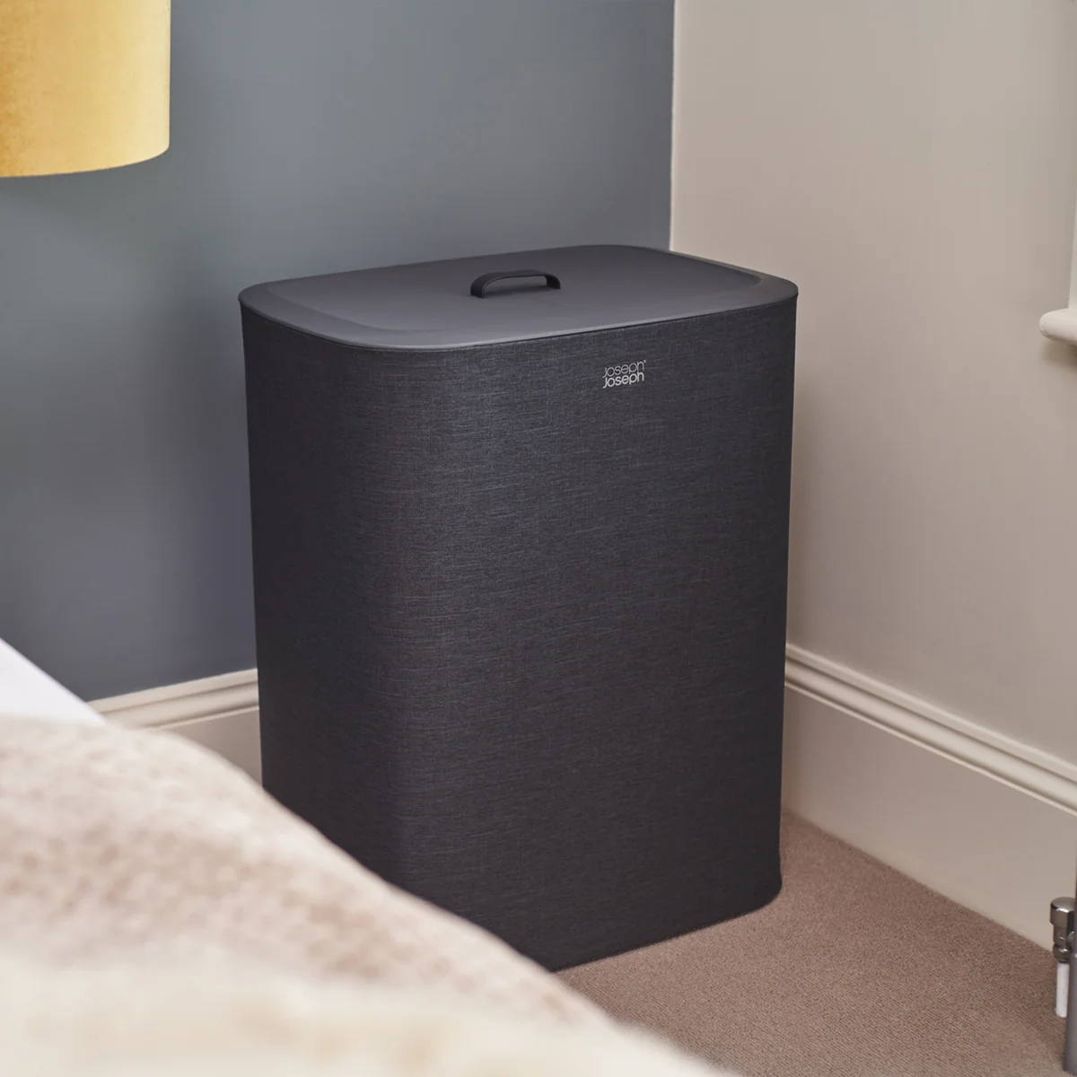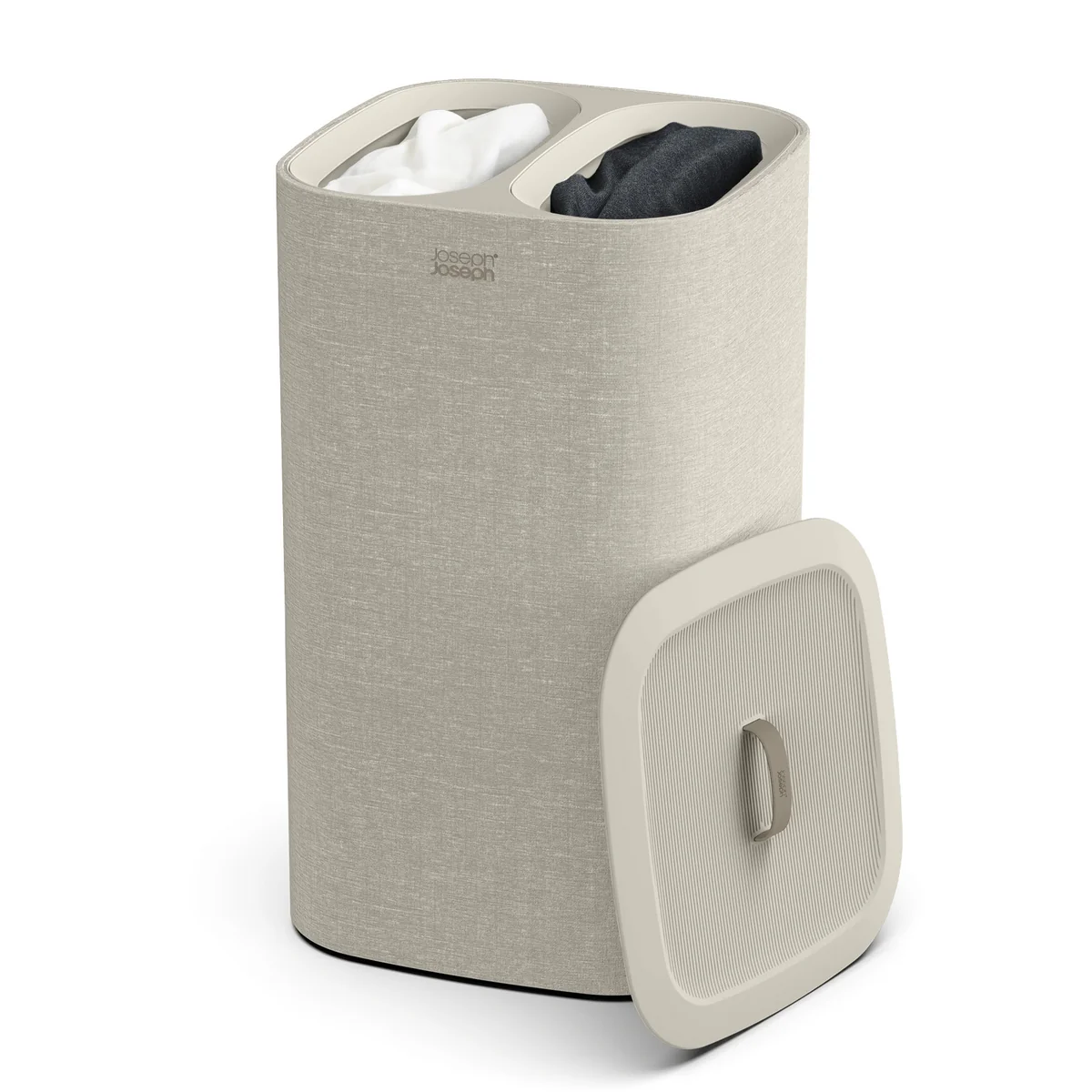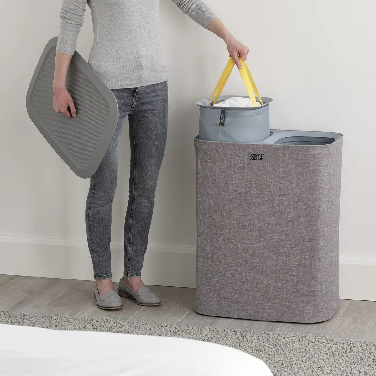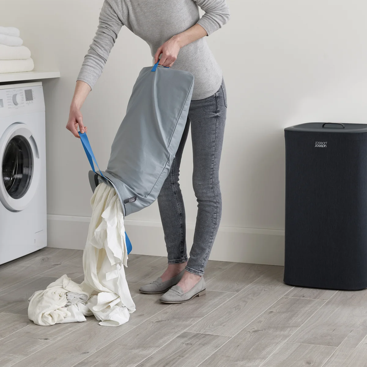 Der Tota Wäschekorb von Joseph Joseph verfügt über eine Vielzahl praktischer Funktionen, die am Waschtag die Arbeit erleichtern: In dem Behälter befinden sich zwei Stofftragetaschen, mithilfe welcher die Wäsche in helle und dunkle Farben getrennt werden kann.