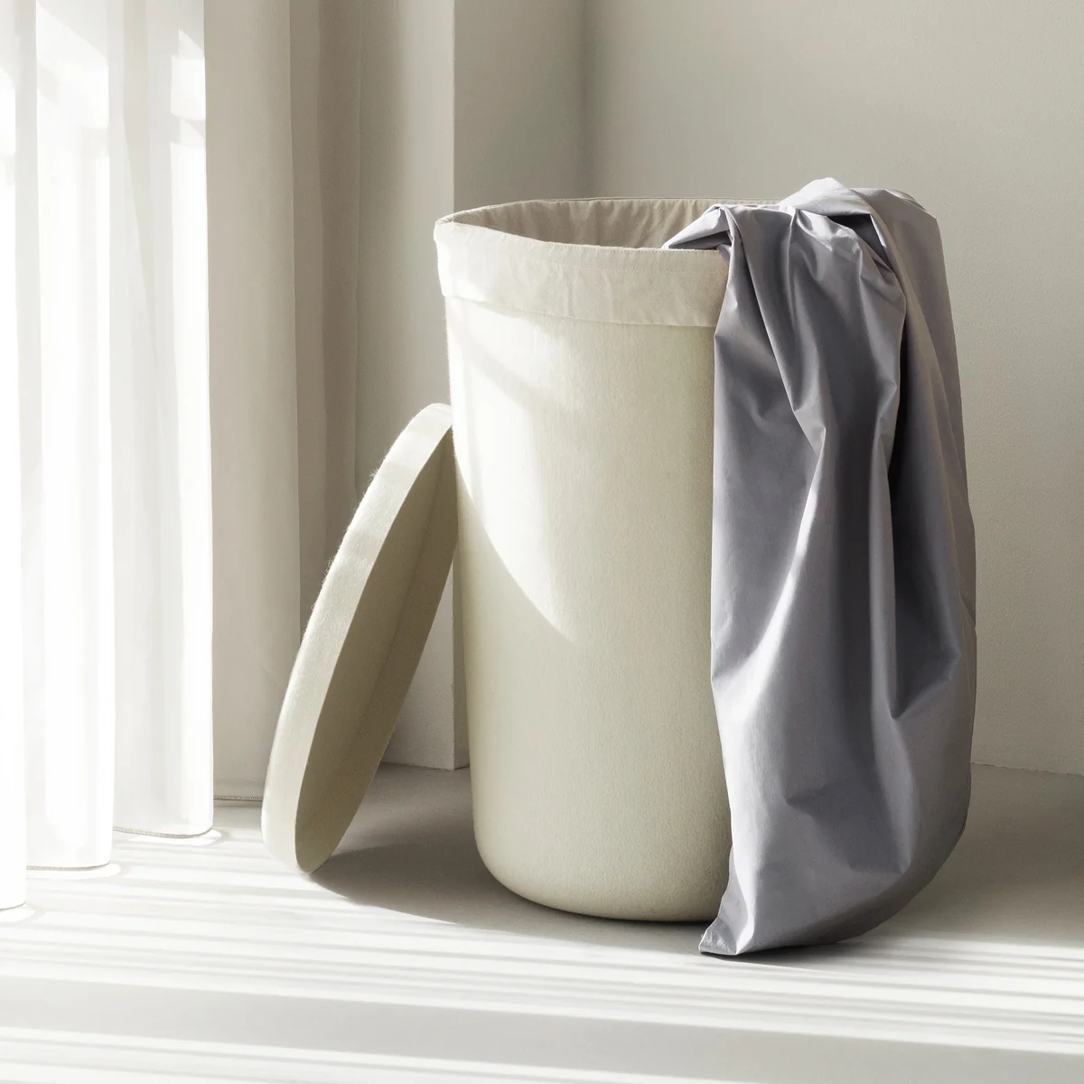 Der Hide Wäschekorb von Normann Copenhagen erweitert die innovative Hide Kollektion um eine stilvolle Lösung für den Alltag. Gefertigt aus robustem PET-Filz aus recycelten Plastikflaschen, vereint sie verantwortungsbewusste Materialwahl mit funktionalem Design. Die längliche, klar definierte Form sorgt für eine elegante Silhouette, während integrierte Griffe ein komfortables Tragen ermöglichen. Ein optionaler Baumwoll-Innensack mit Kordelzug erleichtert den Transport der Wäsche und fügt sich nahtlos in das reduzierte Design ein.