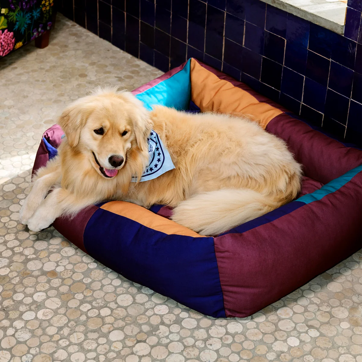 Das Hundebett mit seinem verspielten Farbblock-Design besteht aus robustem, recyceltem Polyester und einem waschbaren, abnehmbaren Kissen, das mit recyceltem Polyester gefüllt ist. Das Bett ist in drei verschiedenen Größen in unterschiedlichen Designs erhältlich.