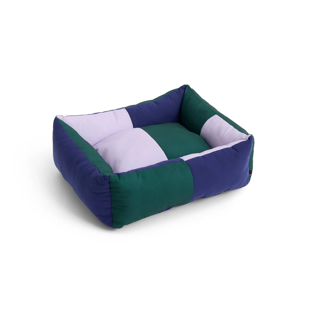 Das Hundebett mit seinem verspielten Farbblock-Design besteht aus robustem, recyceltem Polyester und einem waschbaren, abnehmbaren Kissen, das mit recyceltem Polyester gefüllt ist. Das Bett ist in drei verschiedenen Größen in unterschiedlichen Designs erhältlich.