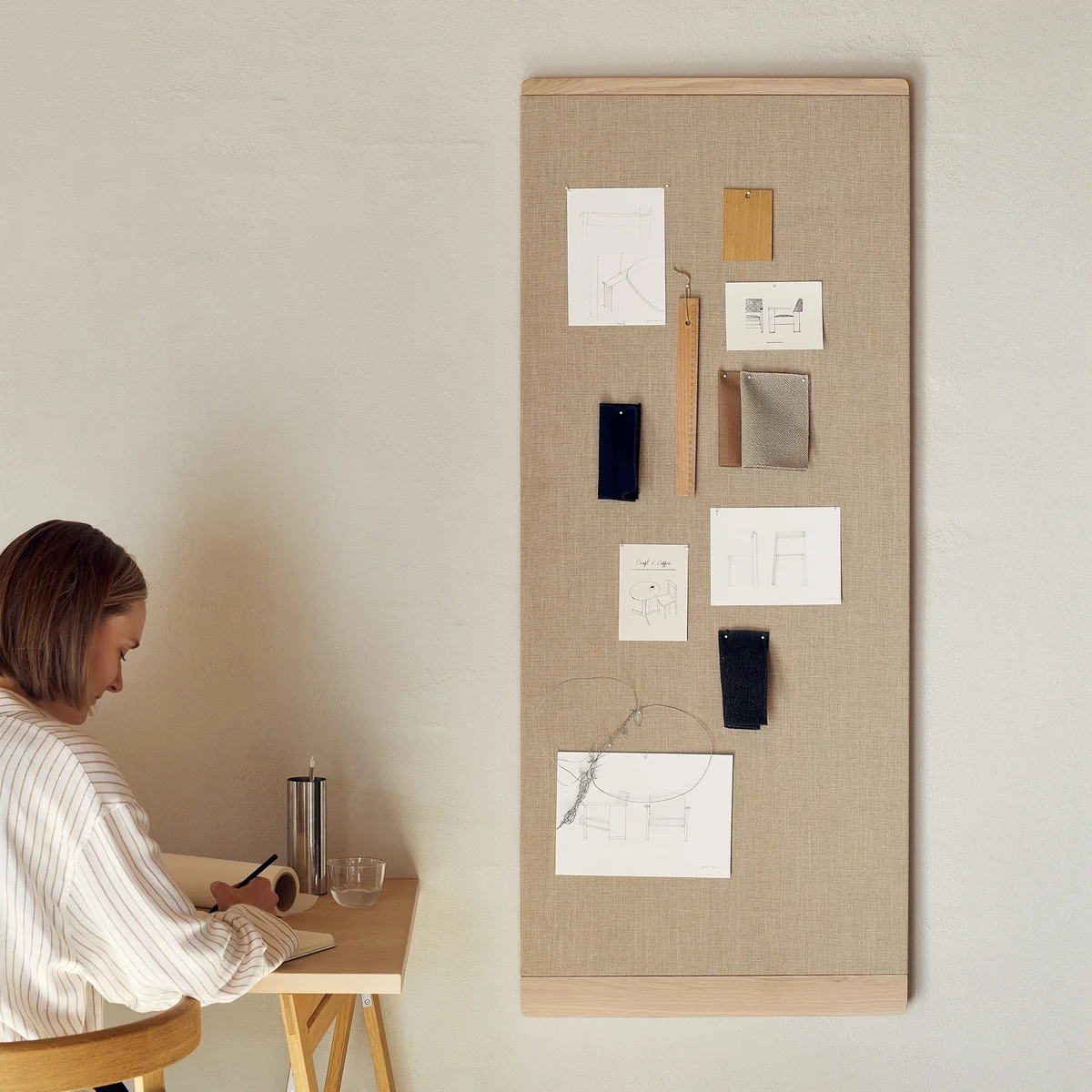 Die Rim Pinwand von Form & Refine ist ein funktionales Designelement, welches aus 100% recyceltem Stoff und Massivholz besteht. Diese beiden Materialkomponenten ergeben einen natürlichen und warmen Look. Die Pinwand ist ein ästhetisches, funktionales Objekt, welches für den modernen Wohnraum konzipiert wurde. Sie ist ein Hilfsmittel, um den Alltag zu organisieren und sich stetig inspirieren zu lassen. Die kleine Ablage bietet zudem die Möglichkeit kleinere Gegenstände wie beispielsweise Stifte aufzubewahren.