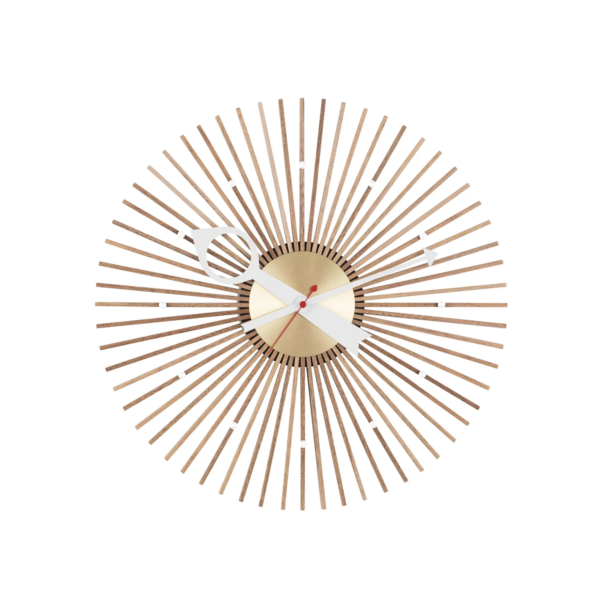 Teil seiner Kollektion sind auch die Wall Clocks, eine Reihe von Wanduhren, die zu Ikonen der 50er Jahre wurden. Vitra legt die Uhren heute neu auf und produziert die Designs in puncto Material und Entwurf ganz nach dem Original. Wie bei zahlreichen Uhren aus der Serie hat Nelson auch bei Popsicle Clock auf Ziffern als Anzeige der Uhrzeit verzichtet. Ihre filigranen Speichen aus Nussbaum-Holz wirken zum einen wie Eisstiele (engl. Popsicle) und erinnern aufgrund ihrere Anordnung an herrliche Sonnenstrahlen.