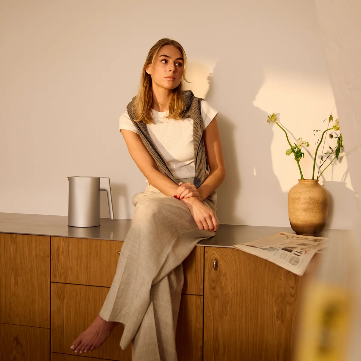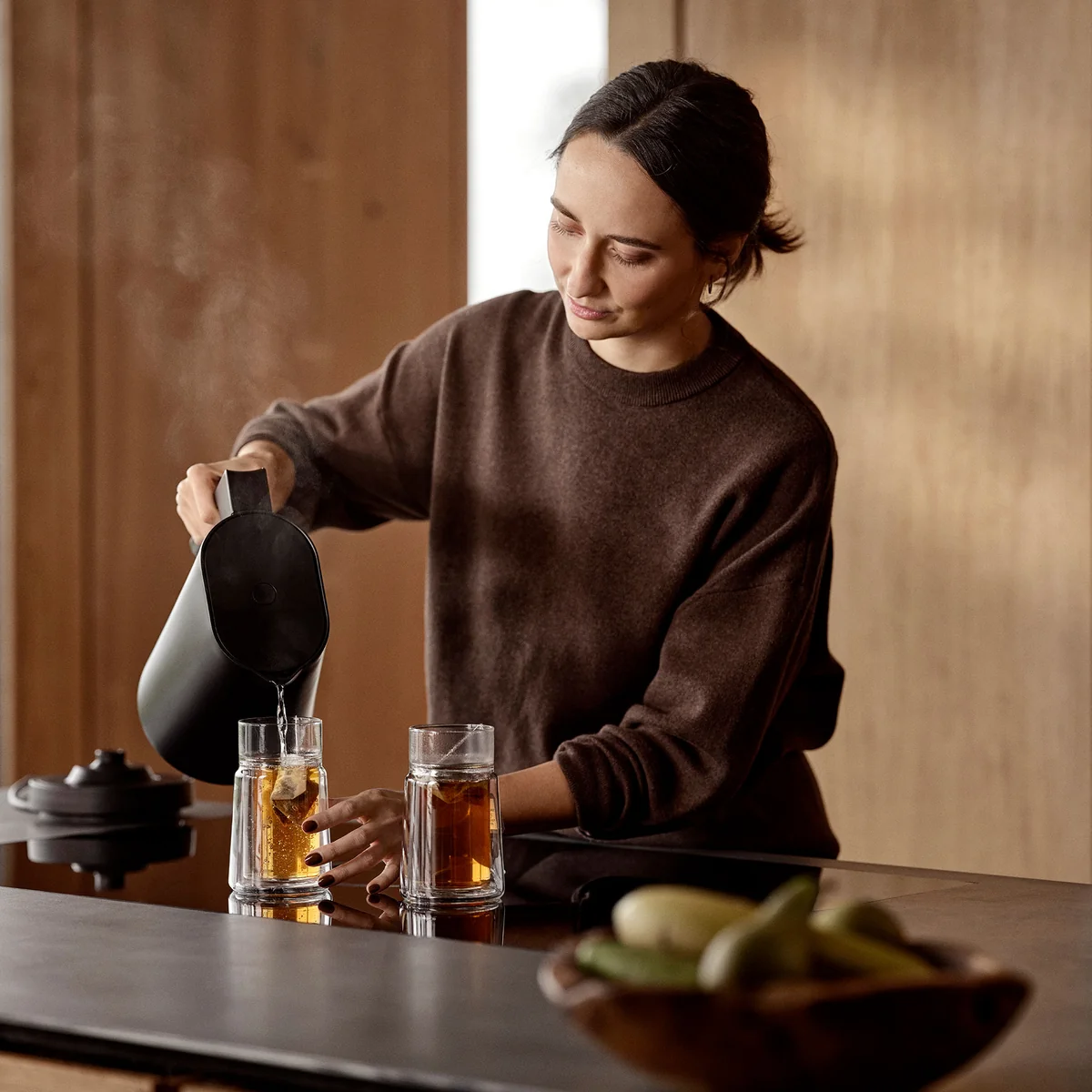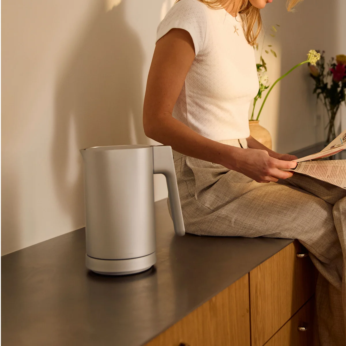 Mit dem neuen elektrischen Wasserkocher von Jacob Jensen wird das tägliche Wasserkochen zum eleganten Erlebnis. Hochwertige Materialien treffen auf durchdachtes Design – das intuitive Touch-Display erwacht bei Annäherung und blendet sich im Ruhemodus dezent aus.