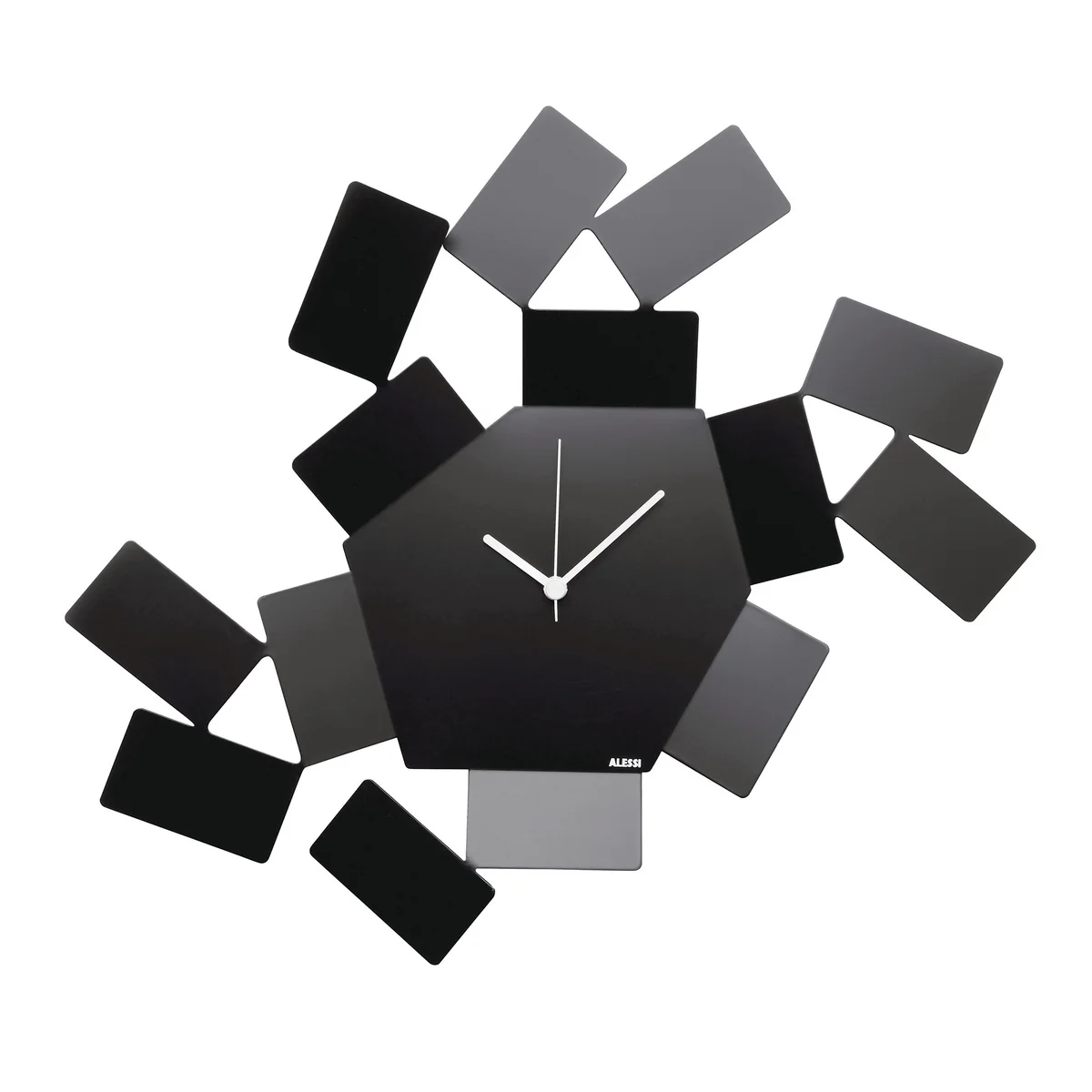 Die unregelmäßigen Formen des sechseckigen Ziffernblattes und der seitlichen Elemente, erzeugen Licht- und Schattenspiele, die dem Gegenstand Magie und Bewegung verleihen. In verschiedenen Varianten begeistert das phantasievolle Design in unterschiedlichsten Interieur.