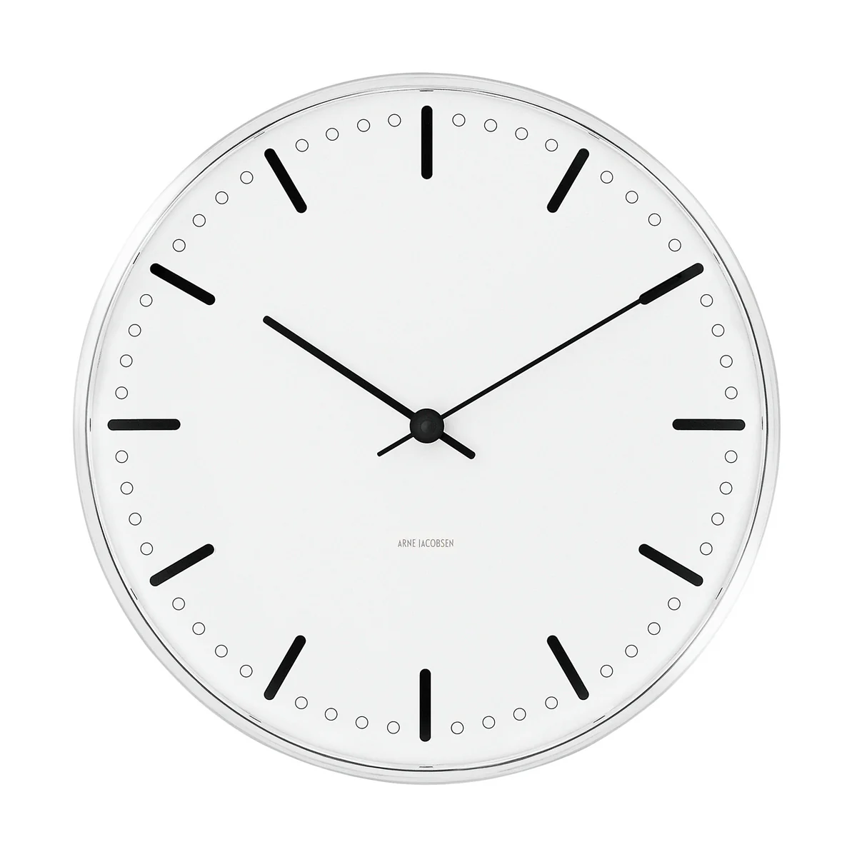 Die City Hall Wanduhr wurde von Arne Jacobsen im Jahr 1956 für die Rødovre City Hall entworfen. Sie besticht durch ihre Schlichtheit, da das abstrakte Ziffernblatt die Stundenzahl durch Striche sowie die Minuten in Punkten wiedergibt.