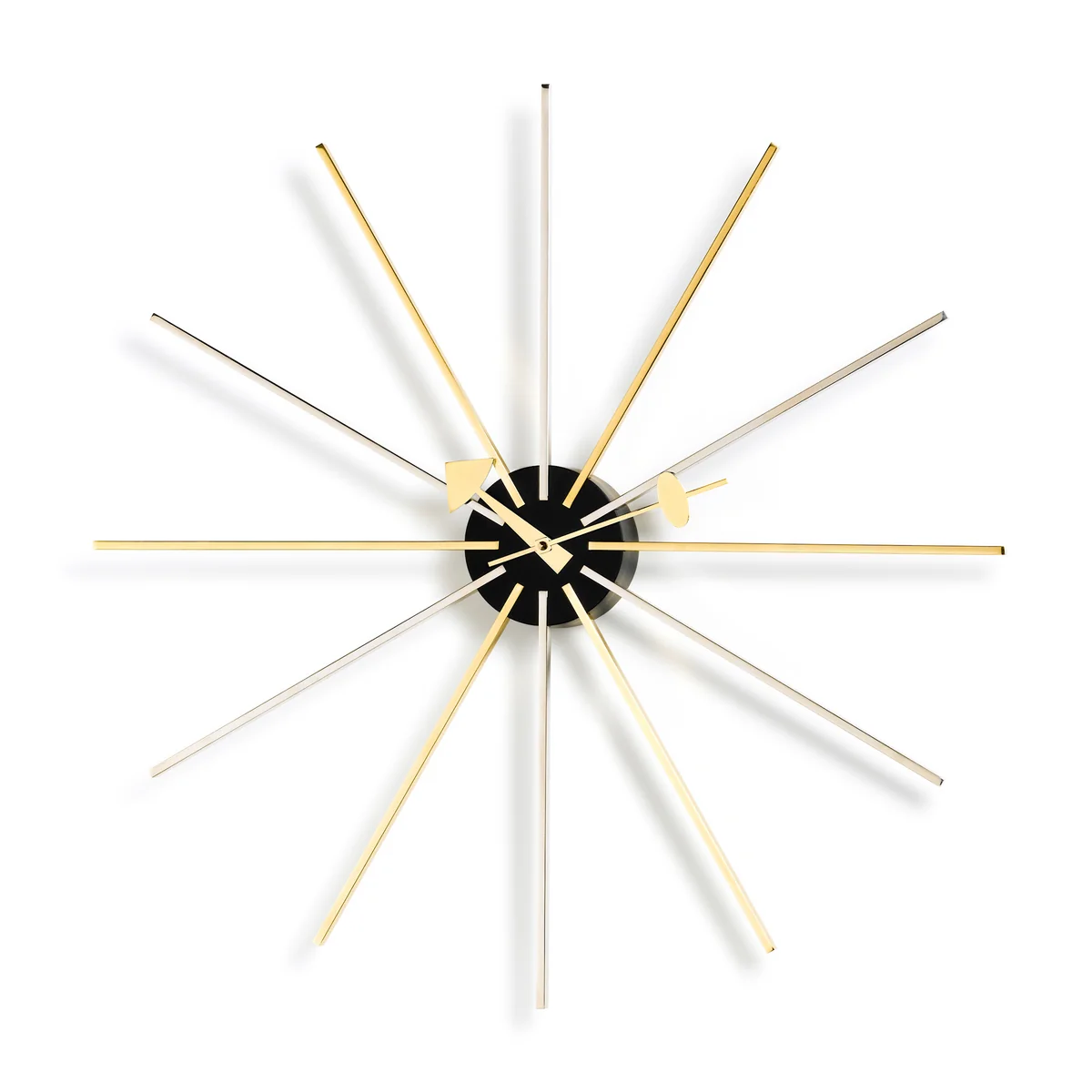 Die Speichen und Zeiger der sternförmigen Uhr bestehen aus Chrom und Messing und wechseln sich in einem Gold und Silberton ab.