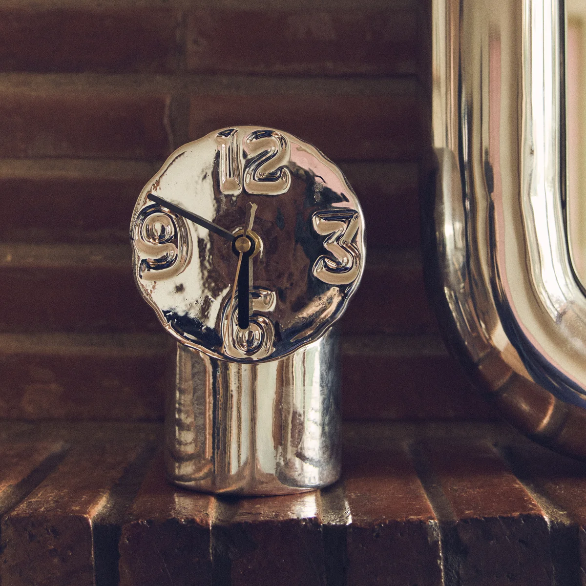 Die Retro Keramik Tischuhr von HKliving vereint Funktionalität mit nostalgischem Charme. Dank handwerklicher Verarbeitung und den natürlichen Unvollkommenheiten, die im Brennvorgang entstehen, ist jede Uhr ein einzigartiges Kunstwerk. Die chromglänzende Glasur und die handbemalte Zifferntafel verleihen der Uhr einen dezenten metallischen Schimmer, der das Licht wunderschön einfängt. Der elegante Chromfinish sorgt für zusätzliche Tiefe und einen polierten Look, der in jedem Raum zum Blickfang wird. Mit ihrer kompakten Größe und dem erfrischenden Farbton verbindet diese Tischuhr mühelos den Charme vergangener Zeiten mit modernem Design und wird so zu einem zeitlosen Highlight in Ihrem Zuhause.