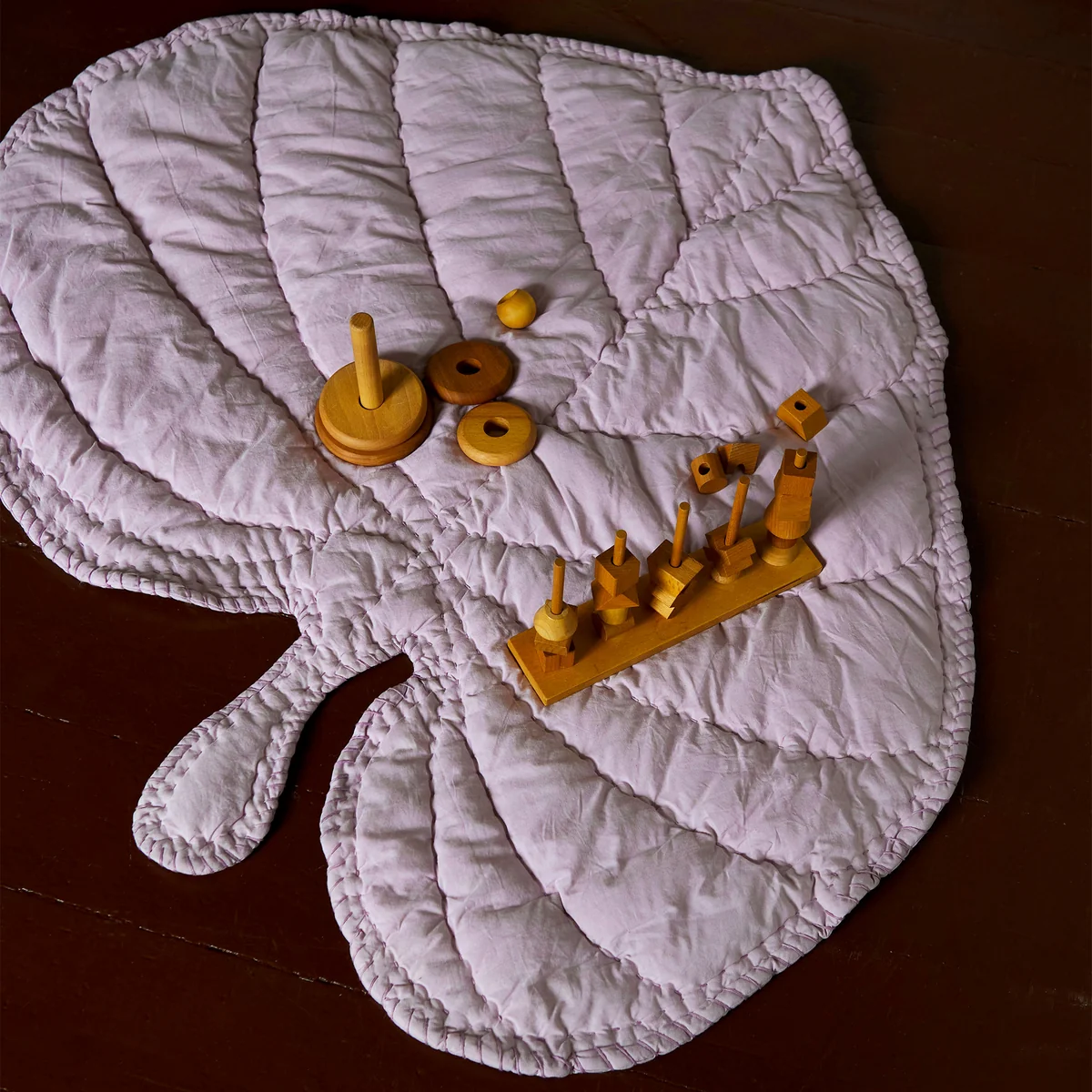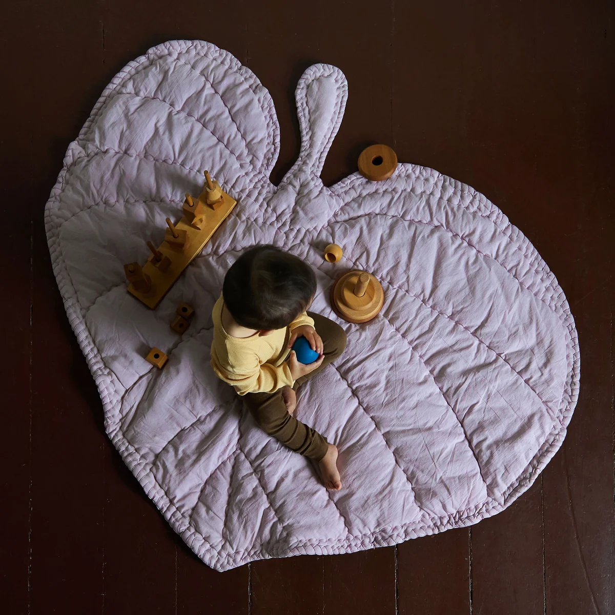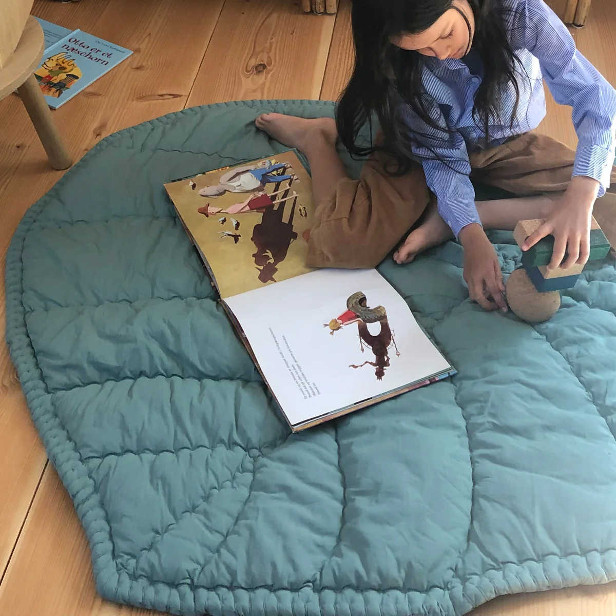 Die Spieldecke besteht aus 100 % handgenähter Bio-Baumwolle gefüllt mit Polyester. In verschiedenen Farben erhältlich fügt sich die Decke gut in jedes Kinderzimmer ein.