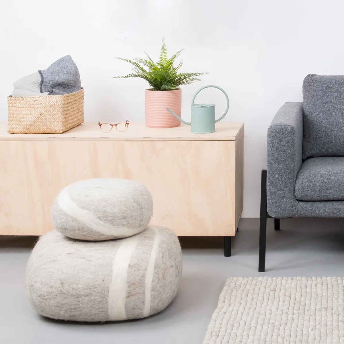 Der Béla Kieselstein Pouf von myfelt verkörpert handwerkliche Raffinesse und zeitgemäßes Design in Perfektion. Hergestellt aus hochwertiger Schafwolle, besticht dieser Pouf durch seine luxuriöse Haptik und erstklassige Qualität. Die sorgfältige Handarbeit und die Verwendung natürlicher Materialien machen ihn nicht nur zu einem ästhetischen Highlight, sondern auch zu einer umweltbewussten Wahl. Der Béla Kieselstein Pouf beeindruckt mit seinem modernen, minimalistischen Design und einer ausgewogenen Farbpalette, die ihn in jeden Raum integrierbar macht. Seine vielseitige Nutzungsmöglichkeit als Sitzgelegenheit, Fußhocker oder dekoratives Element unterstreicht die Funktionalität dieses exquisiten Möbelstücks. Mit seinem zeitlosen Charme setzt der Béla Kieselstein Pouf stilvolle Akzente und verleiht jedem Raum eine elegante Note.