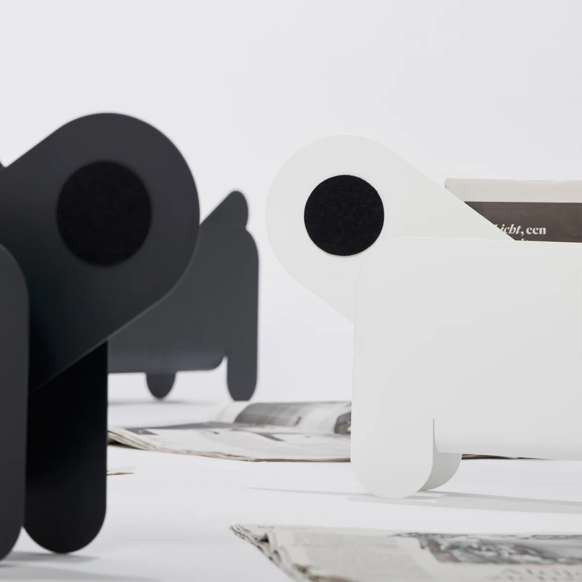 Der Paper Pet Magazinhalter von Frederik Roijé ist ein praktischer Halter, der vom besten Freund des Menschen inspiriert wurde. Dieser treue Freund hält die Zeitungen und Zeitschriften fest und bewahrt sie sicher auf. Dabei ist der kleine minimalistisch gestaltete Hund eine schöne Dekoration in jedem Raum.