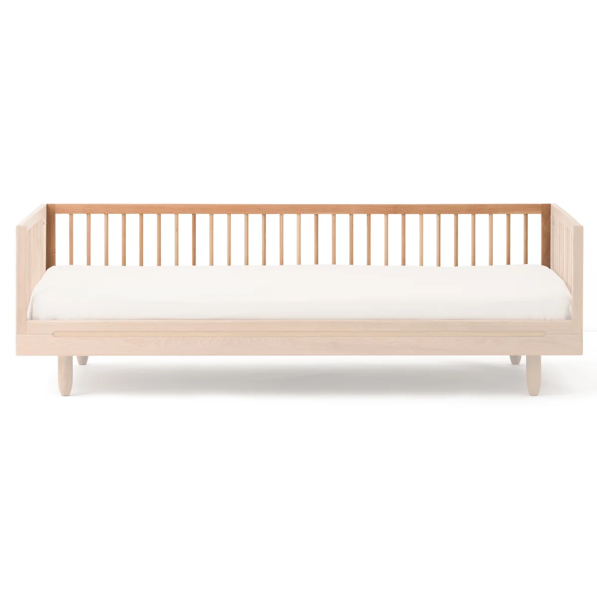 Mit der Sofa Kit Erweiterung lässt sich das Pure Single Bett von Nobodinoz einfach in ein Sofa verwandeln. Das Bett besitzt bereits ein Gitter am Kopf- und Fußende. Durch die Erweiterung kommt eine lange Rückenlehne hinzu, an der man sich anlehnen kann. Gefertigt ist das Gitter aus amerikanischem Eichenholz aus nachhaltigem Anbau. Mit Kissen und Decken ausgestattet, lässt sich das Bett komfortabel und gemütlich gestalten.