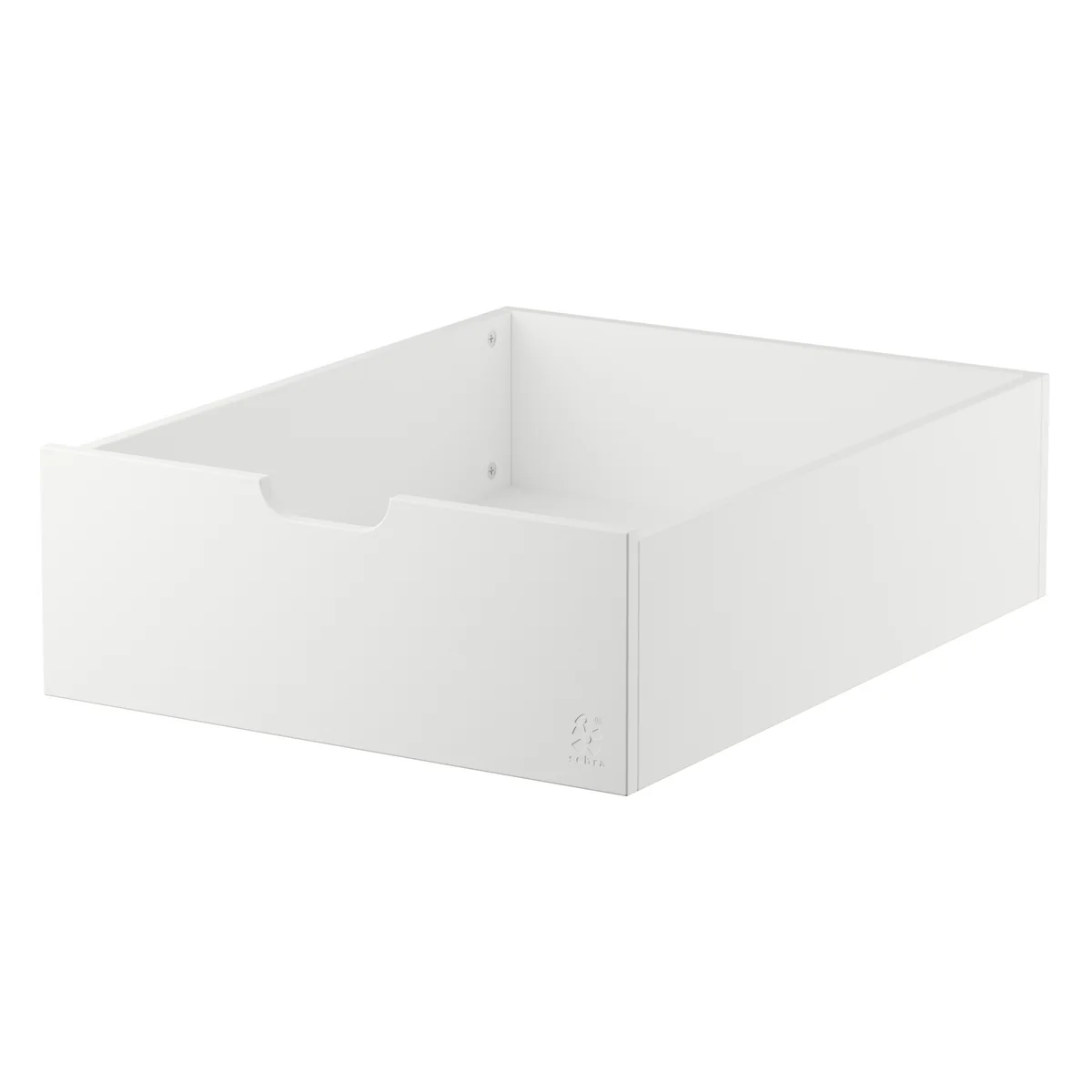 Die Bettschublade wird aus MDF hergestellt. Dank einem abgerundeten, ausgesparten Handgriff in der Mitte der Schublade lässt sich diese zudem einfach handhaben. Wenn das Sebra Bett zum Juniorbett ausgezogen wird, gibt es unter dem Bett Platz für zwei Schubladen.