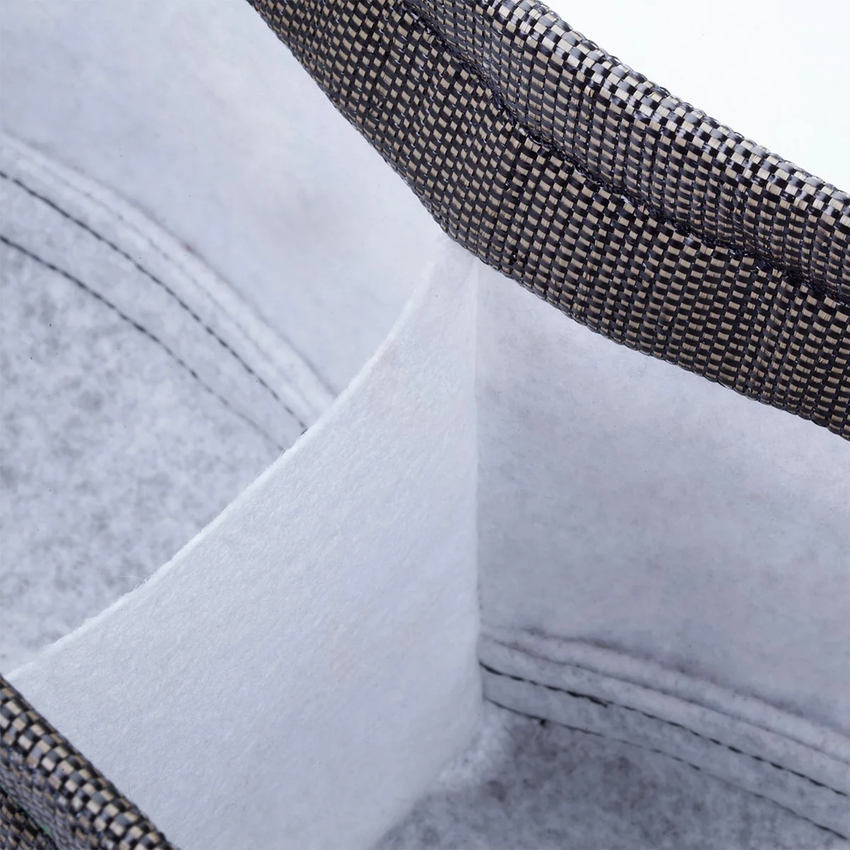 Geotextiler Stoff ist nicht nur verhältnismäßig leicht, sondern bietet der Pflanze und ihrem Boden auch ideale Bedingungen zum wachsen: er lässt das Erdreich atmen, ist wasserdurchlässig und begrenzt gleichzeitig die Verdunstung. Batyline hingegen ist ein doppelwandiges Gewebe, das das notwendige Gleichgewicht zwischen Luft, Boden und Wasser aufrechterhält. Das reißfeste, abrieb- und frostbeständige Außengewebe ist UV-behandelt und hält Temperaturen von -30°C bis 70°C aus. Innen schützt die Filzschicht die Wurzeln, begrenzt die Verdunstung und verteilt das Wasser. Zudem ist das Gewebe durchlässig, lässt sie den Boden atmen und das Wasser abfließen. Es ist eben so wie das Geotextil zu 100% recycelbar.