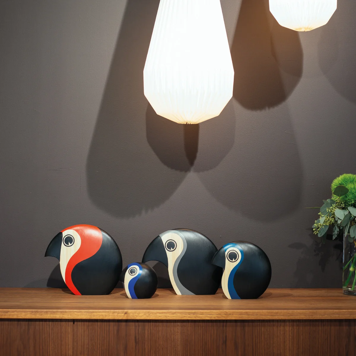 Die Discus Deko-Vögel von ArchitectMade sind ein Entwurf von Hans Bølling aus dem Jahr 1961. Der Name der Holzfiguren leitet sich von dem antiken Sportgerät ab, das formgebend war bei diesem Entwurf. Inspiriert wurde der Vogel jedoch von der Vorliebe Bølling für Papageie. Im Laufe seiner Karriere als Architekt zierte der kleine Vogel zahlreiche Architekturzeichnungen und Gebäude als diskrete Andeutung im Hintergrund. Diese persönliche und humorvolle Signatur des Architekten hat nun in den Discus Vögeln ihre Form gefunden.