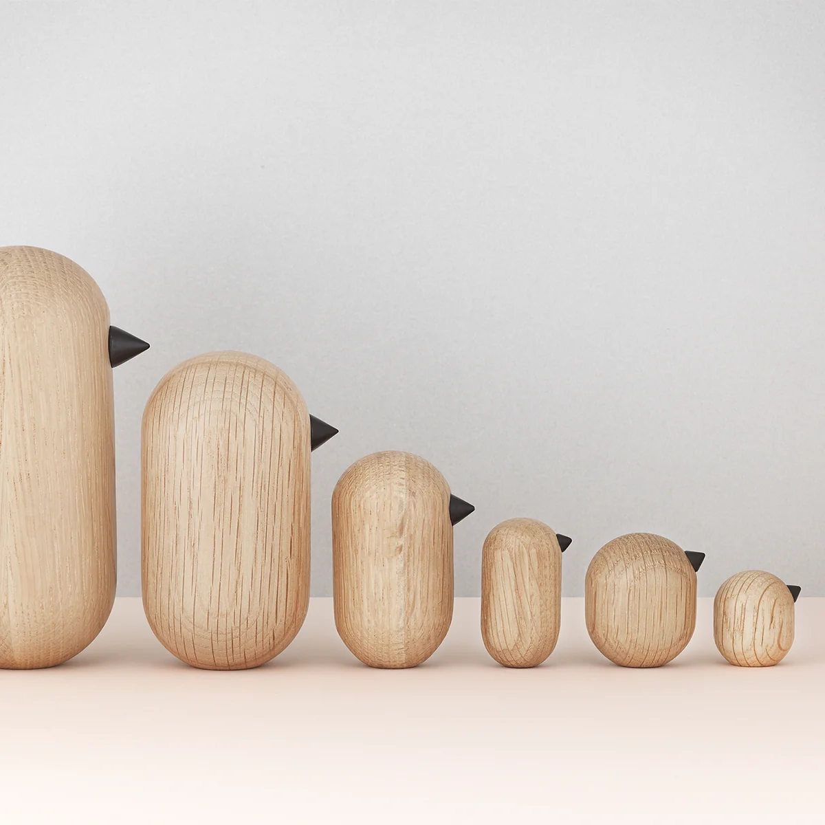 Little Bird wird aus Eichenholz gedrechselt und mit einem kleinen Schnabel verziert. Die Figur ist in sechs verschiedenen Größen erhältlich, die zusammen eine harmonische Vogel-Familie ergeben. Die sechs Größen variieren nicht nur in ihrer Höhe, sondern auch ganz leicht in ihrer Breite. So bekommt jede Größe einen ganz eigenen Charakter.
