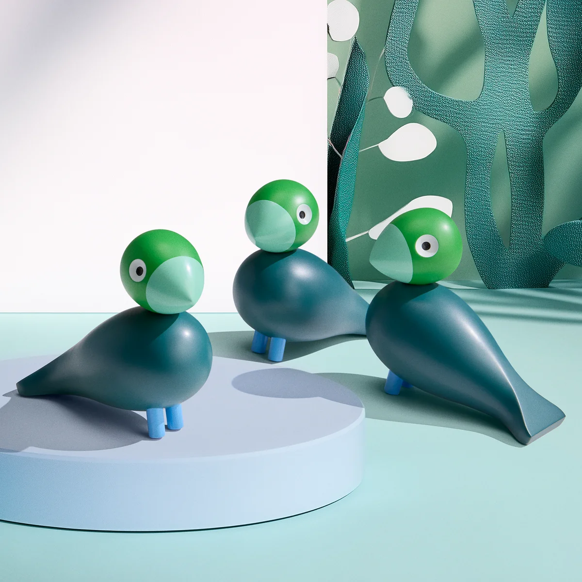 - Kay: Singvogel Kay ist nach seinem Erschaffer selbst benannt: Kay Bojesen. Als Fan blauer Anzüge, Shirts oder Krawatten, erstrahlt natürlich auch das gefiederte Ebenbild des Designers in freundlichen Blautönen.