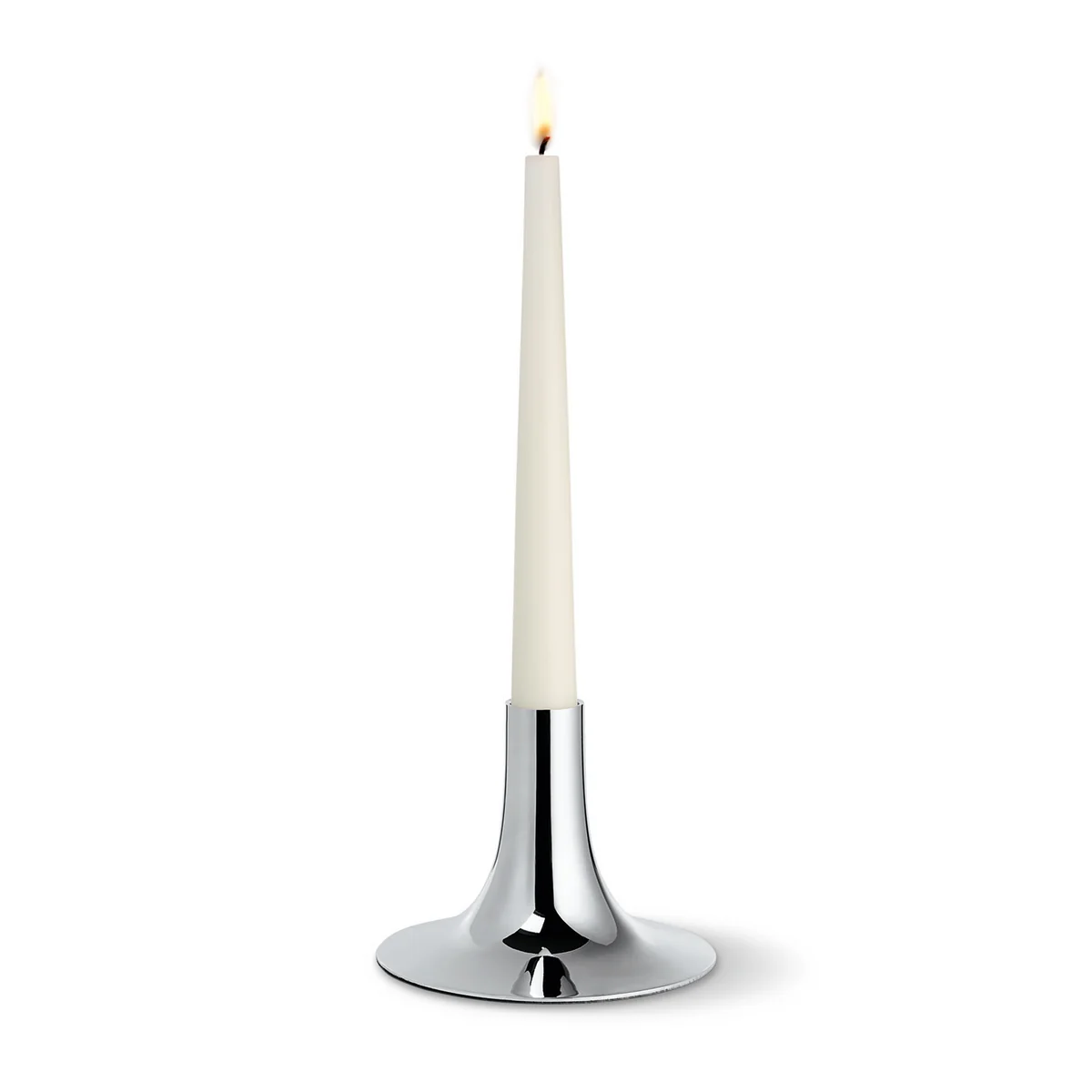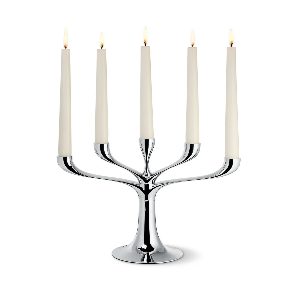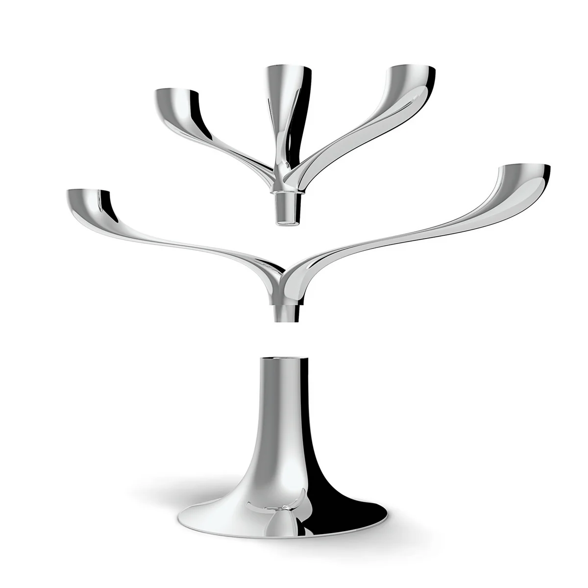 Der aus Metallguss hergestellte und anschließend hochglanzpolierte Chrom-Kerzenständer besteht aus einer Basis, auf dem Aufsätze für drei oder für fünf Kerzen befestigt werden können. Somit kann der Kerzenhalter für die Adventszeit ebenso genutzt werden wie für gesellige Dinnerabende oder gemütliche Herbst-Tage.