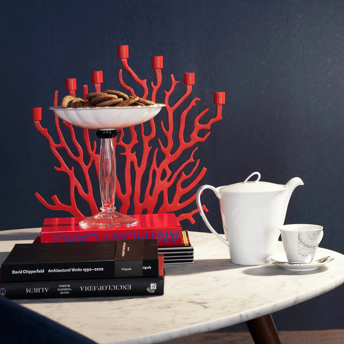 Tenochtitlan war die Hauptstadt des sagenumwobenen Aztekenreichs. Ähnlich geheimnisvoll wie die untergegangene Stadt ist auch der Kerzenhalter des italienischen Designers Vittorio Locatelli. Rote Äste scheinen aus dem Fuß zu wachsen und ihre Spitzen zieren Kerzen. Eine mögliche Designassoziation könnten die Korallenriffe der Südsee sein.