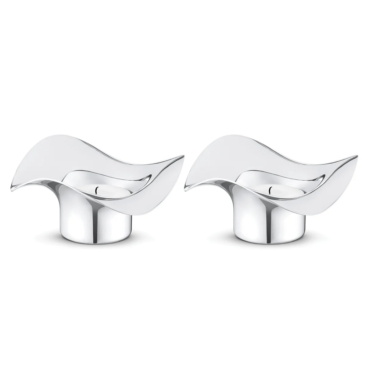 Halter für Teelichte mit wellenartigem Rand aus der Cobra Kollektion, entworfen von Constantin Wortmann. Die einzigartige Form verleiht dem Design etwas poetisches und bleibt dabei elegant. Die Teelichthalter aus glänzendem Edelstahl sind im 2er-Set erhältlich und vervollständigen jede Tischdekoration mit Eleganz und etwas Unerwartetem.