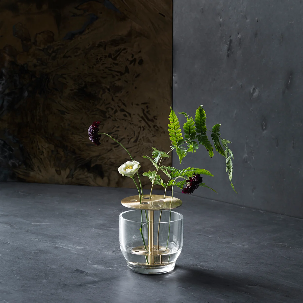 Die Lochplatte aus massivem Messing oder Edelstahl, die das Glasgefäß ergänzt, erlaubt es Stilblüten, Sträucher oder Gräser zu einem floralen Arrangement zusammenzustellen.