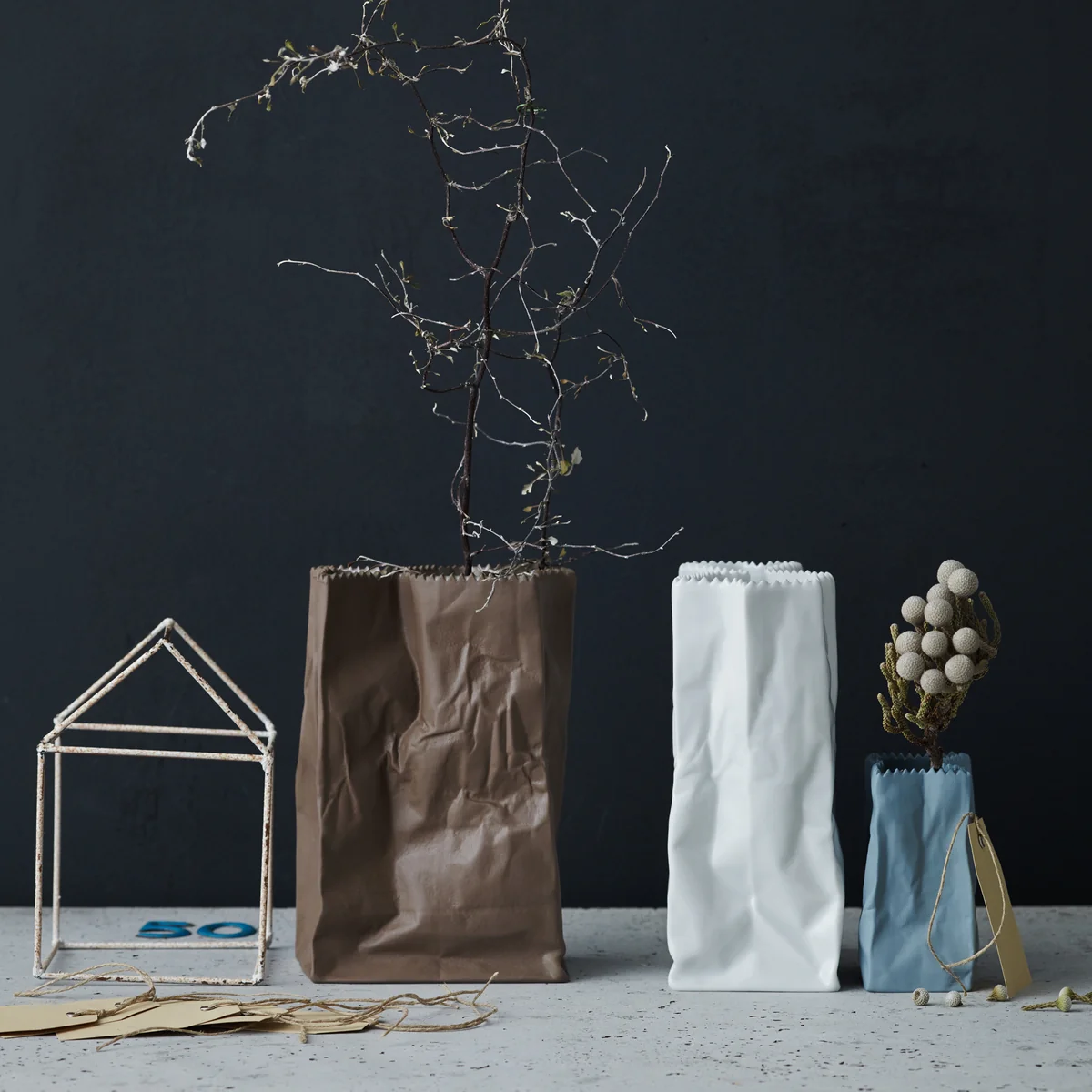 Die Vase wurde bereits 1977 entworfen und ist inspiriert von der einfachen Form einer Papiertüte. Die charakteristischen Knicke, Falten und der Zickzack-Rand einer solchen Tüte werden in der Tütenvase perfekt imitiert. In Porzellan verewigt wird die Papiertüte in Vasenform zum Designobjekt erhoben. Der Reiz liegt in dem Kontrast zwischen einer vermeidlich einfachen Tütenform und der hochwertigen Materialverarbeitung aus Porzellan.