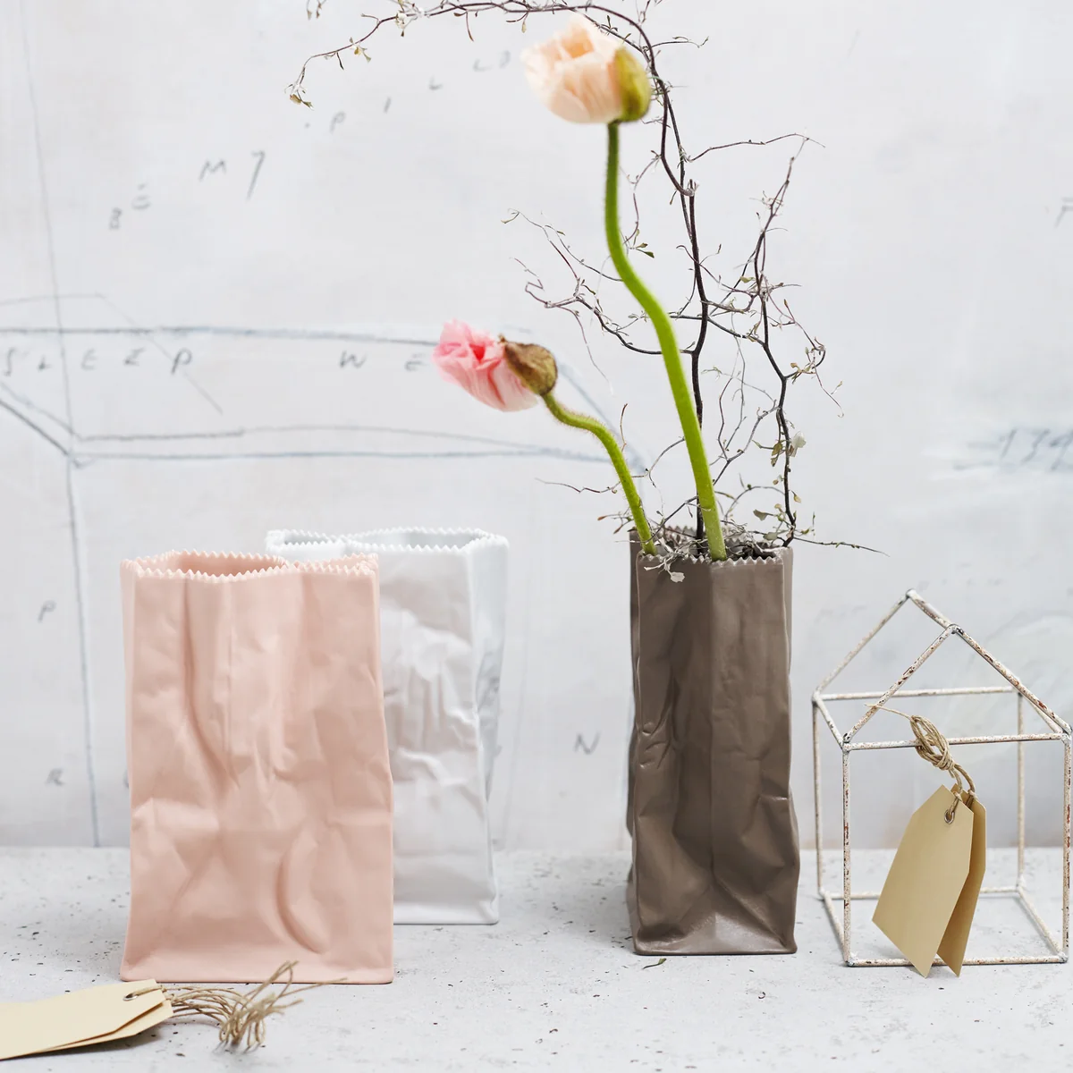 Die originelle Tütenvase von Designer Tapio Wirkkalas zählt zu den beliebtesten Entwürfen des traditionsreichen Porzellanunternehmen Rosenthal und ist Teil der "Do not litter"-Kollektion (auf Deutsch: "Hinterlassen Sie keinen Müll"). In dieser Kollektion werden Alltagsgegenstände und Wegwerfartikel wie Papiertüten, Dosen und Milchkartons mit Hilfe von hochwertigen Materialien neu interpretiert.