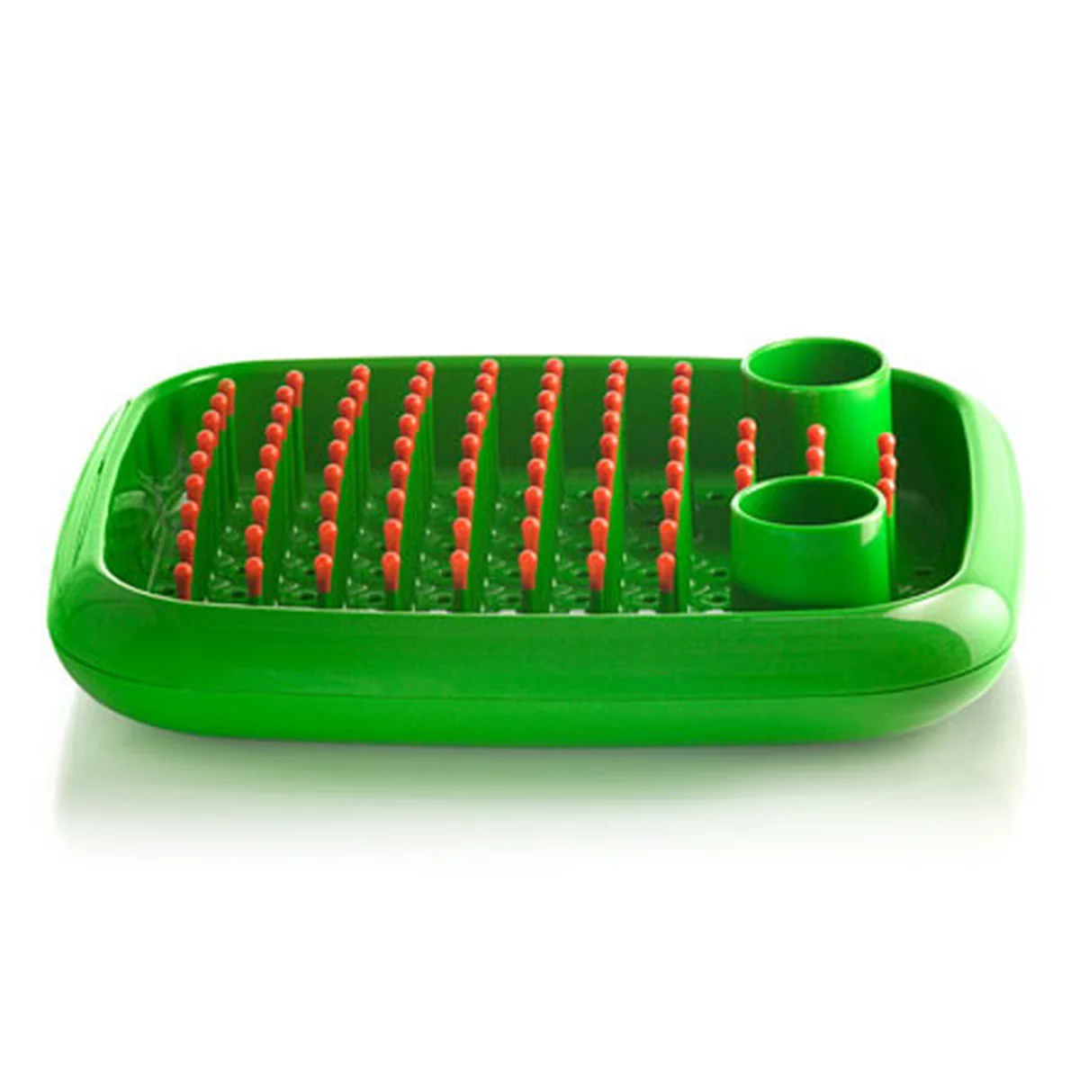 Der "Abwasch Doktor" kommt Ihnen auch gerne in kleinen Küchen und an kleinen Spülbecken zur Hilfe. Sein integriertes Speicherbecken fängt die Tropfen auf, die Stifte mit Noppen halten Geschirr jeder Größe und für das Besteck sind zusätzlich zwei Besteck-Abtropf-Behälter eingebaut.