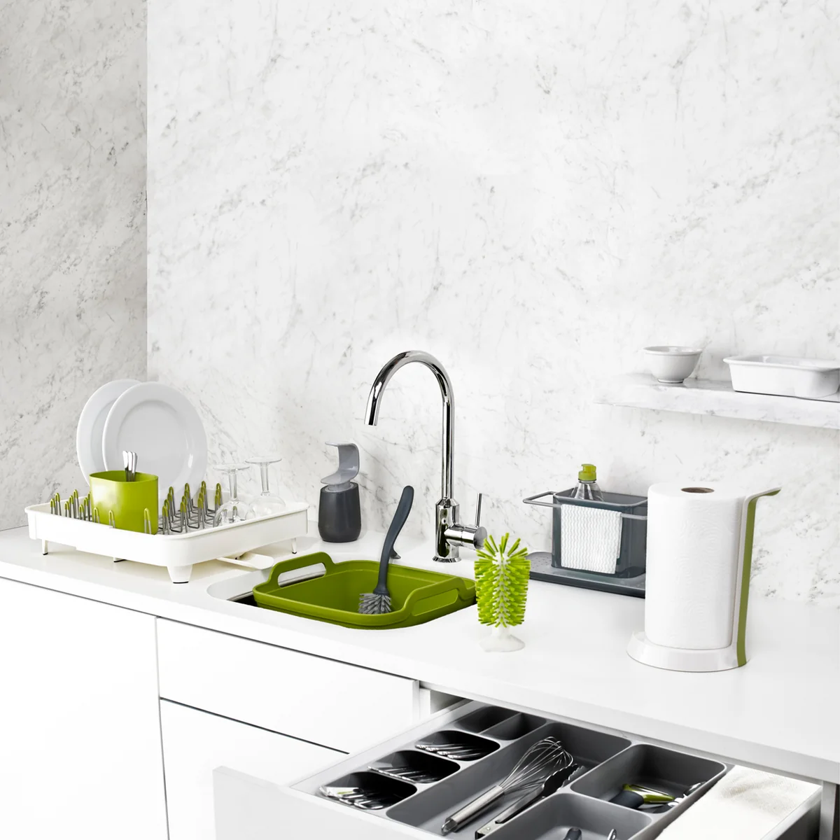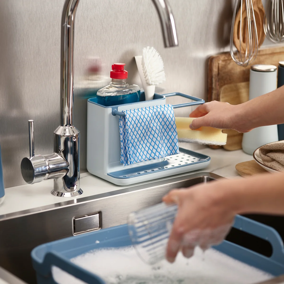 Ordnung ist das halbe Leben. Joseph Joseph trägt mit seinen Küchenhelfern dazu bei, dass Ordnung halten nicht schwer fällt. Denn der Caddy verbindet mehrere Funktionen miteinander. Der Hauptteil bietet viel Platz für Bürste und Spülmittel. An der Stange lassen sich feuchte Lappen oder Putztücher aufhängen.