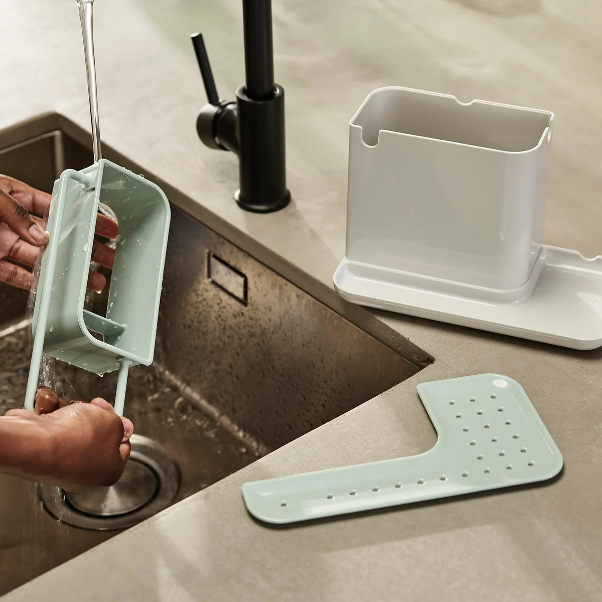 Dank der großen Abtropfplatte finden auch nasse Schwämme im Caddy Utensilienbehälter ihren Platz, ohne die Küche nass zu machen: Der darunterliegende Auffangbehälter sorgt zuverlässig für eine trockene Arbeitsfläche. Für eine einfache Reinigung ist der Caddy von Joseph Joseph leicht zerlegbar und spülmaschinenfest.