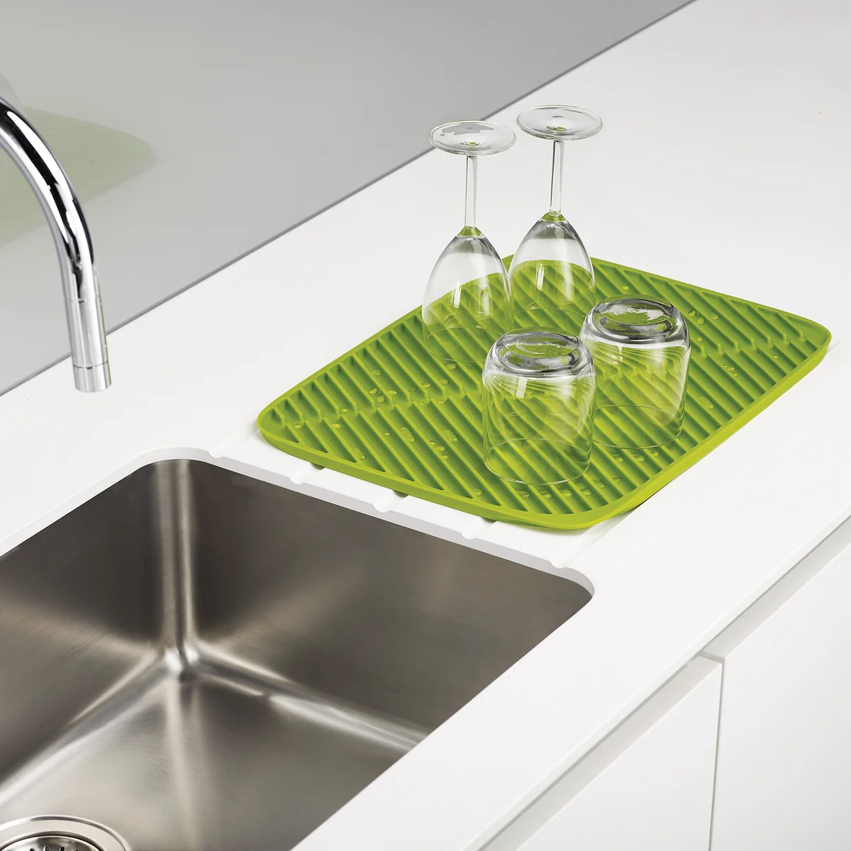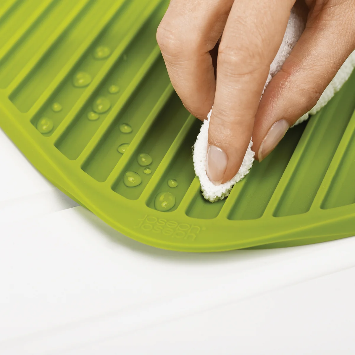 Nach dem Besuch von Gästen türmt sich häufig das Geschirr am Waschbecken. Gerade Teller und zerbrechliche Weingläser verbrauchen dabei viel Platz. Studio 17 hat mit der Abtropfmatte für Joseph Joseph einen Gebrauchsgegenstand geschaffen, der beim lästigen Abwasche Abhilfe schafft.