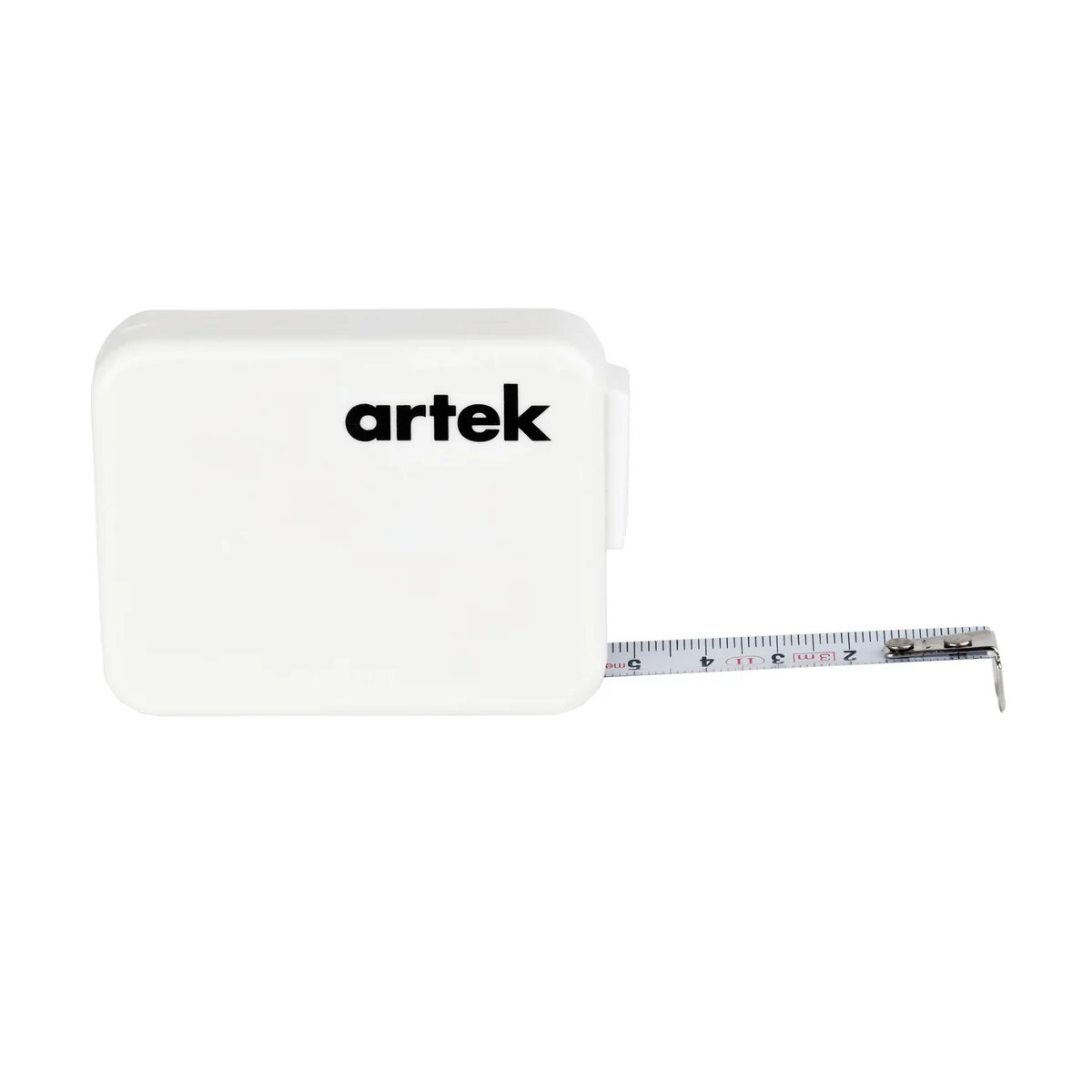 Das Maßband von Artek kommt in einem schlichten, weißen Metallgehäuse mit prominentem Logo. Mit insgesamt 3 Metern Länge können mit dem Maßband von Artek kleine und größere Flächen vermessen werden.