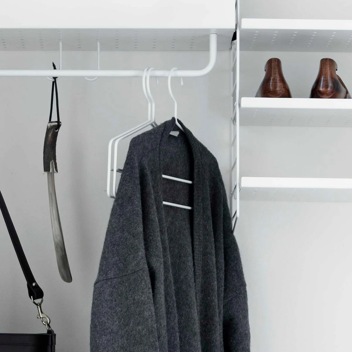 Durch Kleiderstangen und Haken lässt sich String im Handumdrehen zur Garderobe umfunktionieren, die im Flur alle Blicke auf sich zieht. Mit den passenden Kleiderbügeln, die perfekt auf das Regalsystem abgestimmt sind, können Mäntel, Schals und Jacketts ordentlich und sichtbar an der Garderobe ihren Platz finden. Selbstverständlich lässt sich mit dem String Regal auch ein Kleiderschrank-System kreieren, bei dem die Kleiderbügel zum Einsatz kommen. Ein zusätzlicher zweiter Steg bewahrt dabei Hosen und Röcke knitterfrei auf.
