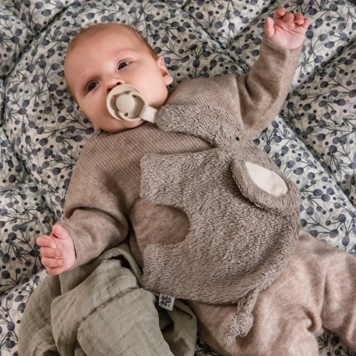 Fanto der Elefant ist Kuscheltier, Schnuffeltuch und Schnullerhalter in einem – liebevoll aus zertifiziertem Bio-Baumwollplüsch gefertigt und speziell für kleine Hände gemacht. In sanftem Grau gehalten, begleitet es Kinder zuverlässig durch den Alltag – vom Kinderwagen bis ins Bettchen. Der Klettverschluss am Rüssel sorgt dafür, dass der Lieblingsschnuller immer sicher befestigt ist. Mit seinen weichen Ohren und dem geknoteten Schwanz lädt Fanto zum Erkunden ein und vermittelt Geborgenheit – ein treuer Begleiter in jeder Lebenslage.