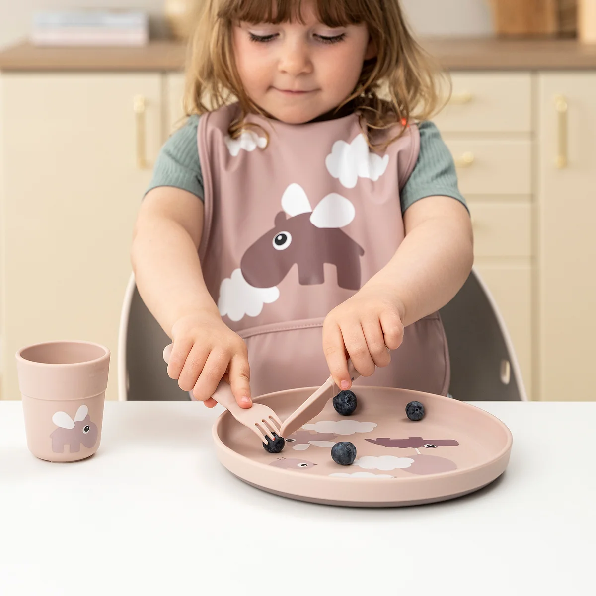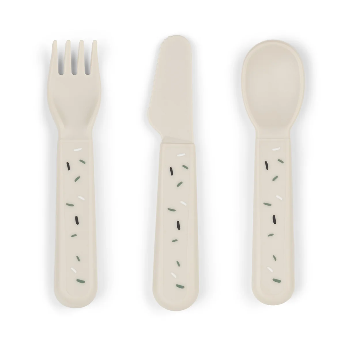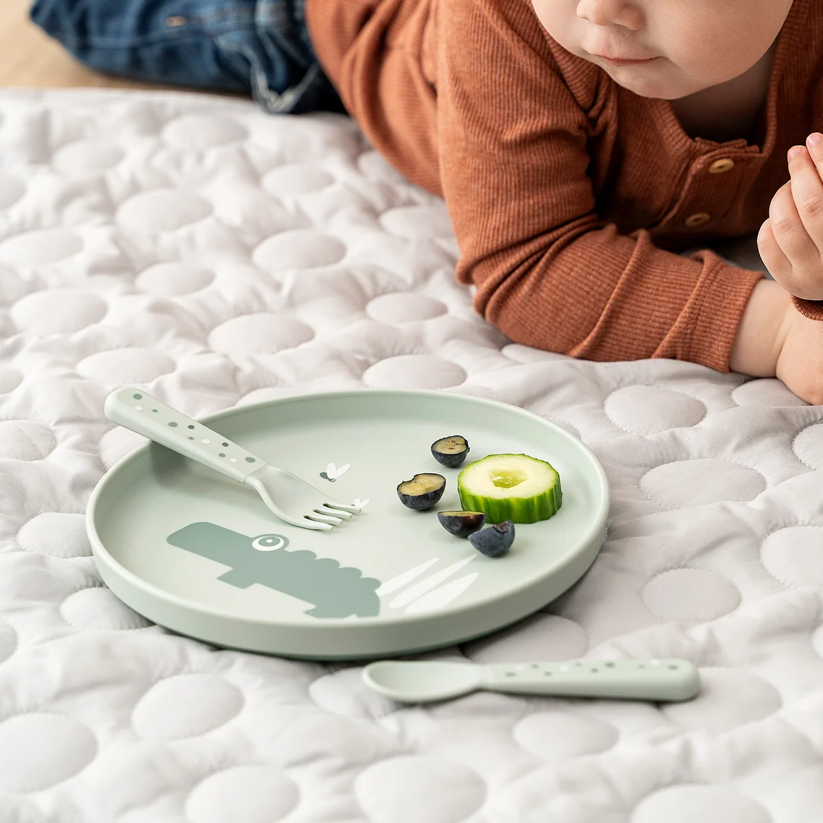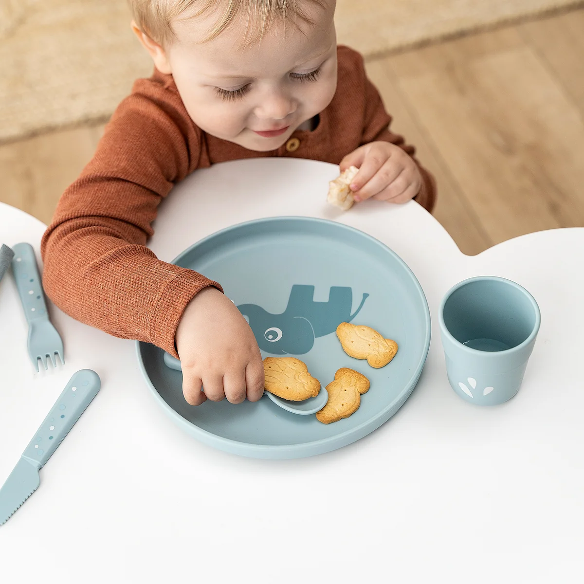 Das Besteck-Set ist ergonomisch geformt und auf die Bedürfnisse von kleinen Händen abgestimmt. Die abgerundeten Kanten und kindgerechten Größen machen es ideal für die ersten Schritte zum eigenständigen Essen.