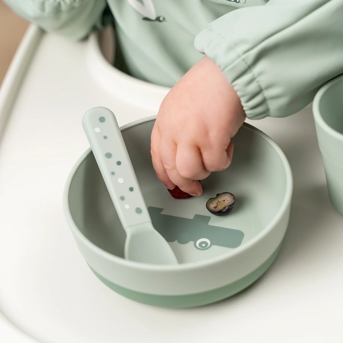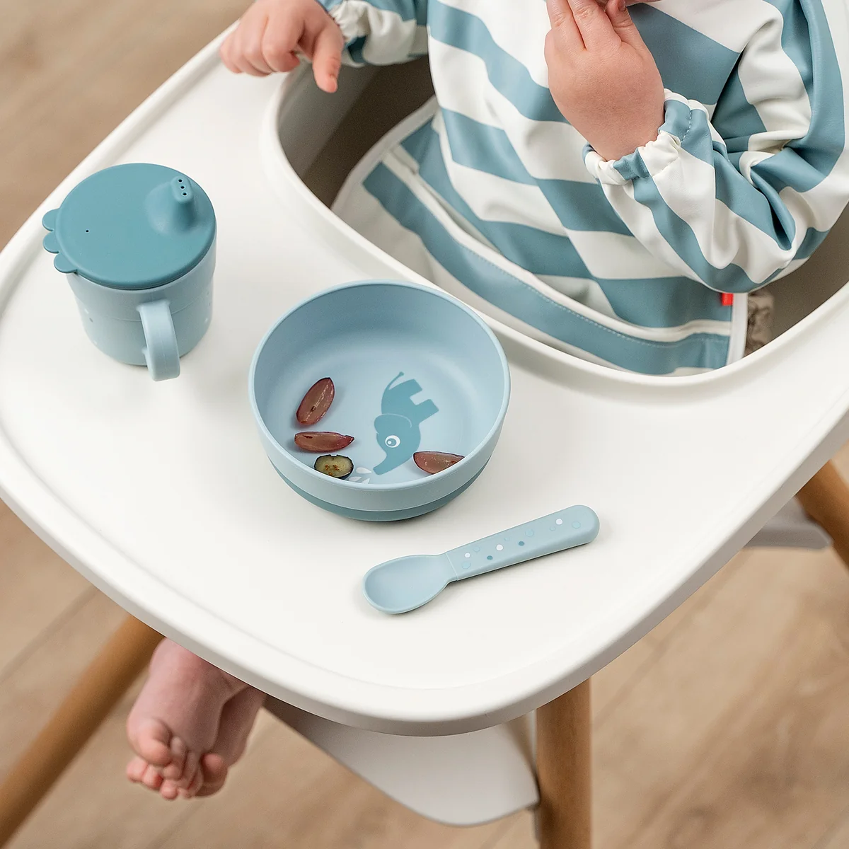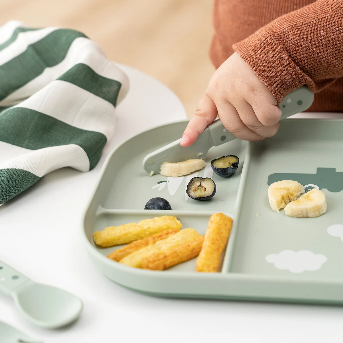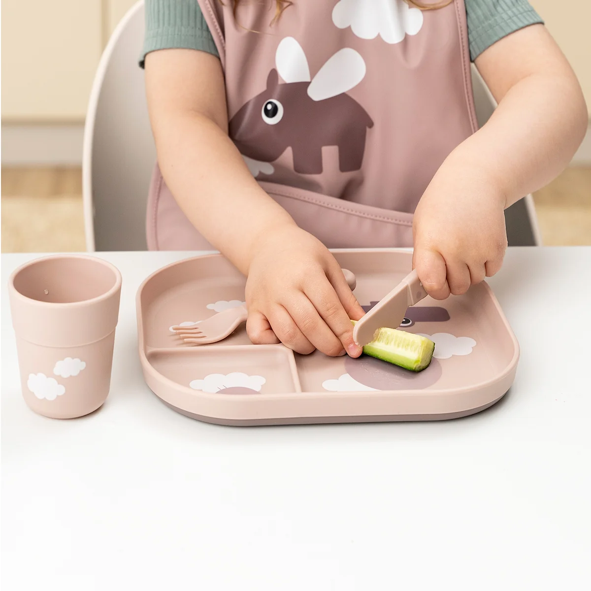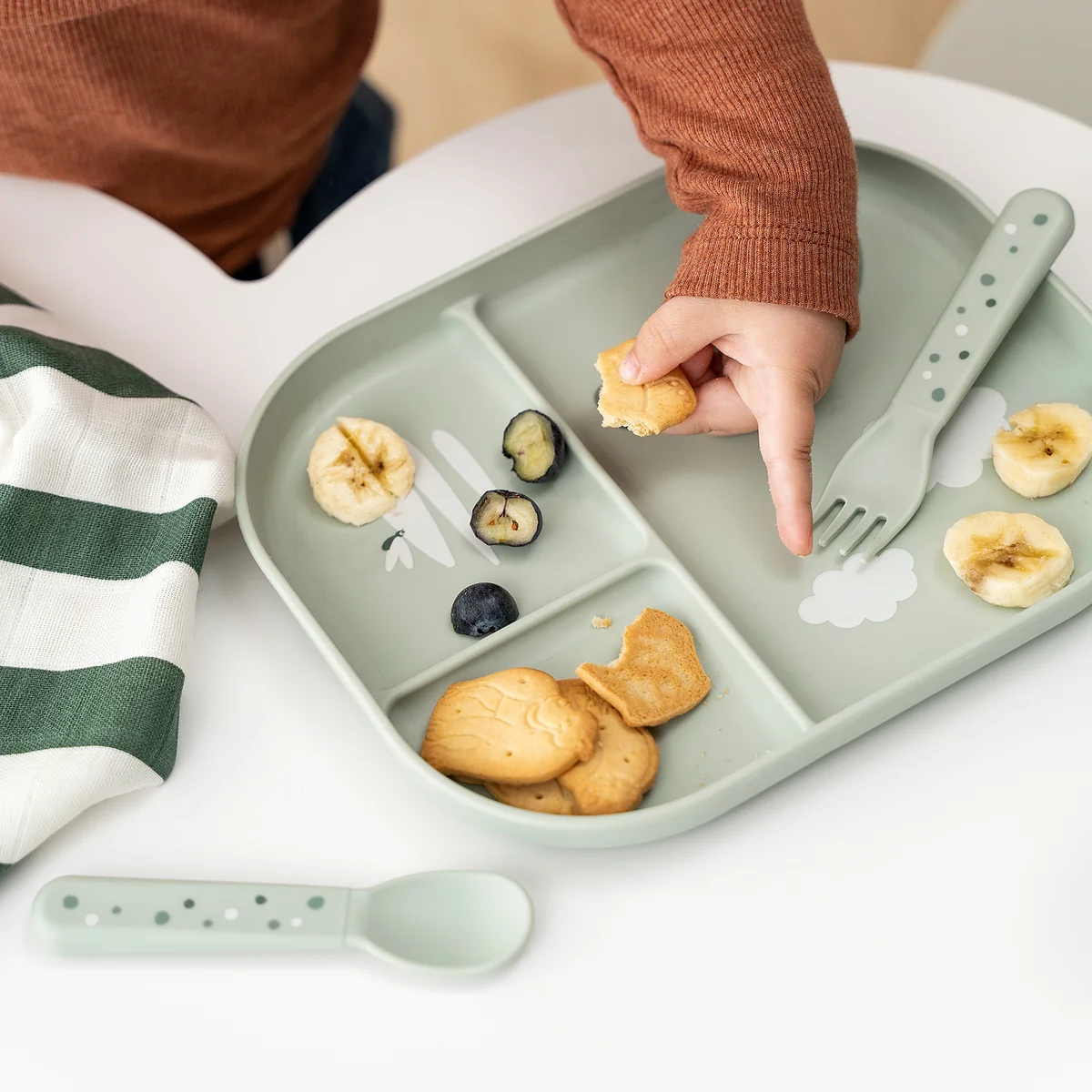 Das Besteck-Set ist ergonomisch geformt und auf die Bedürfnisse von kleinen Händen abgestimmt. Die abgerundeten Kanten und kindgerechten Größen machen es ideal für die ersten Schritte zum eigenständigen Essen.