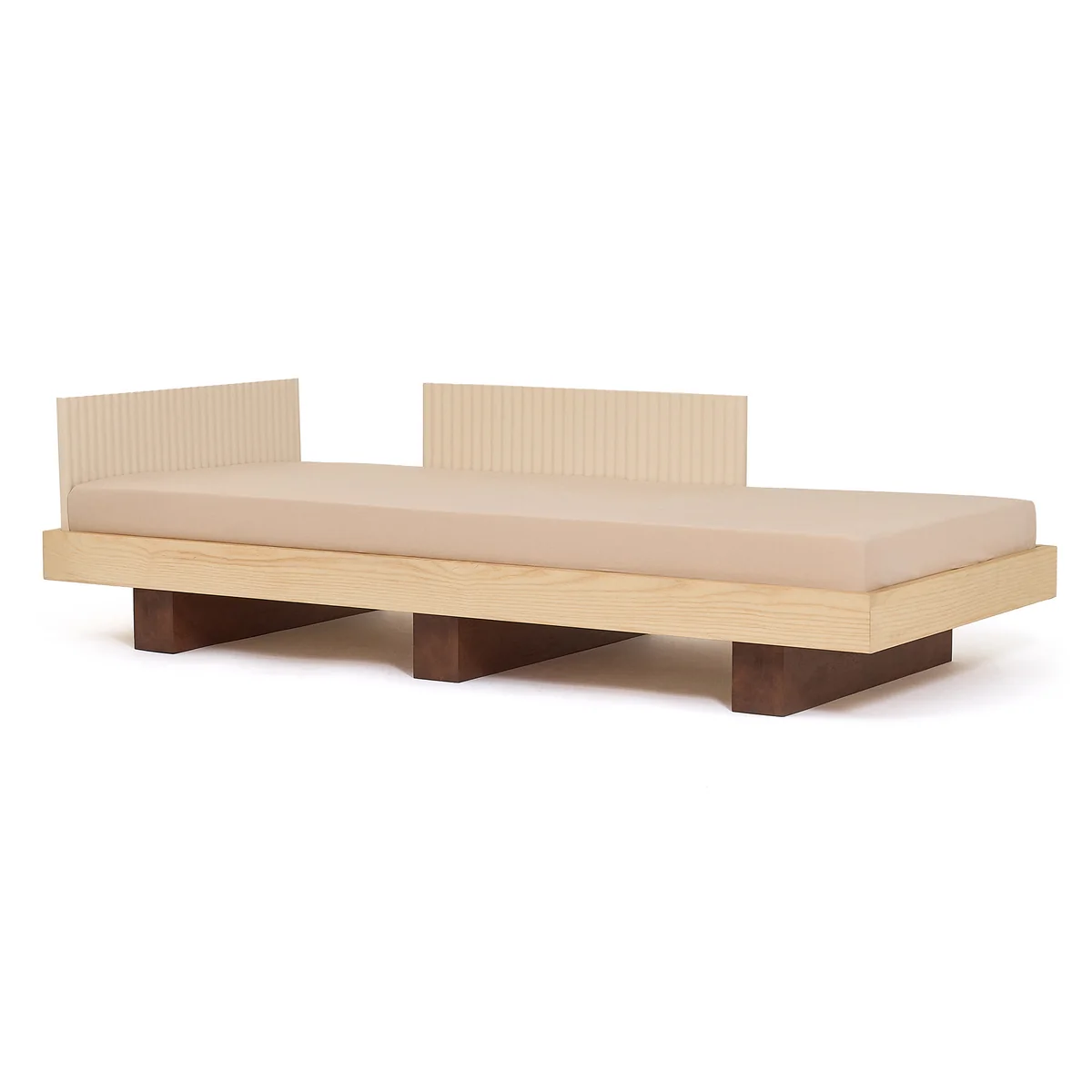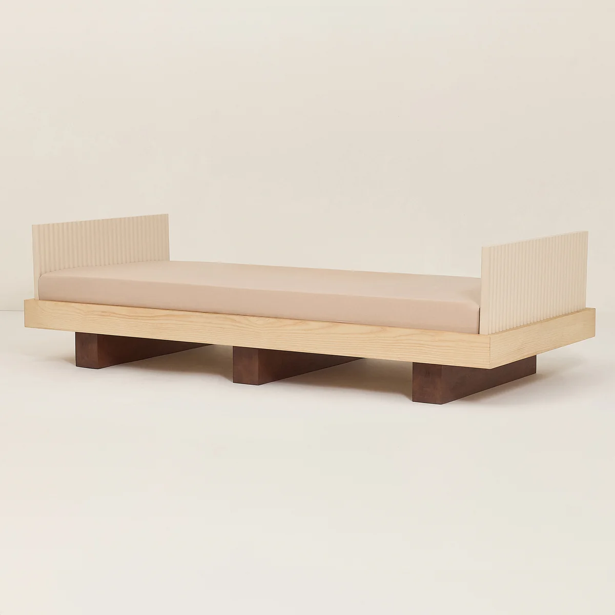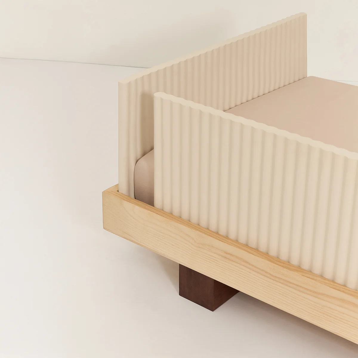 Die markanten Bettfüße, inspiriert von traditionellen japanischen Geta-Sandalen, verleihen dem Design eine elegante Schlichtheit mit kulturellem Bezug. Seitenteile mit feinen Rillen schaffen ein spannendes Spiel aus Licht und Schatten und laden Kinder dazu ein, die Struktur mit den Fingern zu erkunden – eine harmonische Verbindung von Ästhetik und Haptik.
