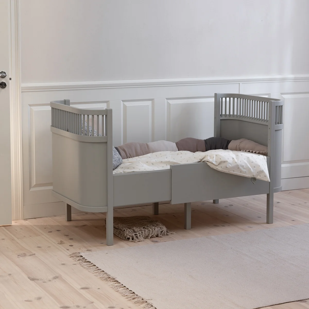 Das Sebra Bett aus Birkenholz eignet sich bereits für neugeborene Kinder und wächst mit dem Kind mit, indem es mithilfe des verstellbaren Bodens von ca. 112,5 cm auf eine Länge von ca. 155 cm erweitert wird. Das Gitter umrahmt das Bett vollständig und stellt damit sicher, dass das Baby oder das Kleinkind beim Schlafen nicht aus dem Bett rollt. Die Seitengitter können dabei wahlweise am Bett befestigt bleiben oder abgenommen werden.