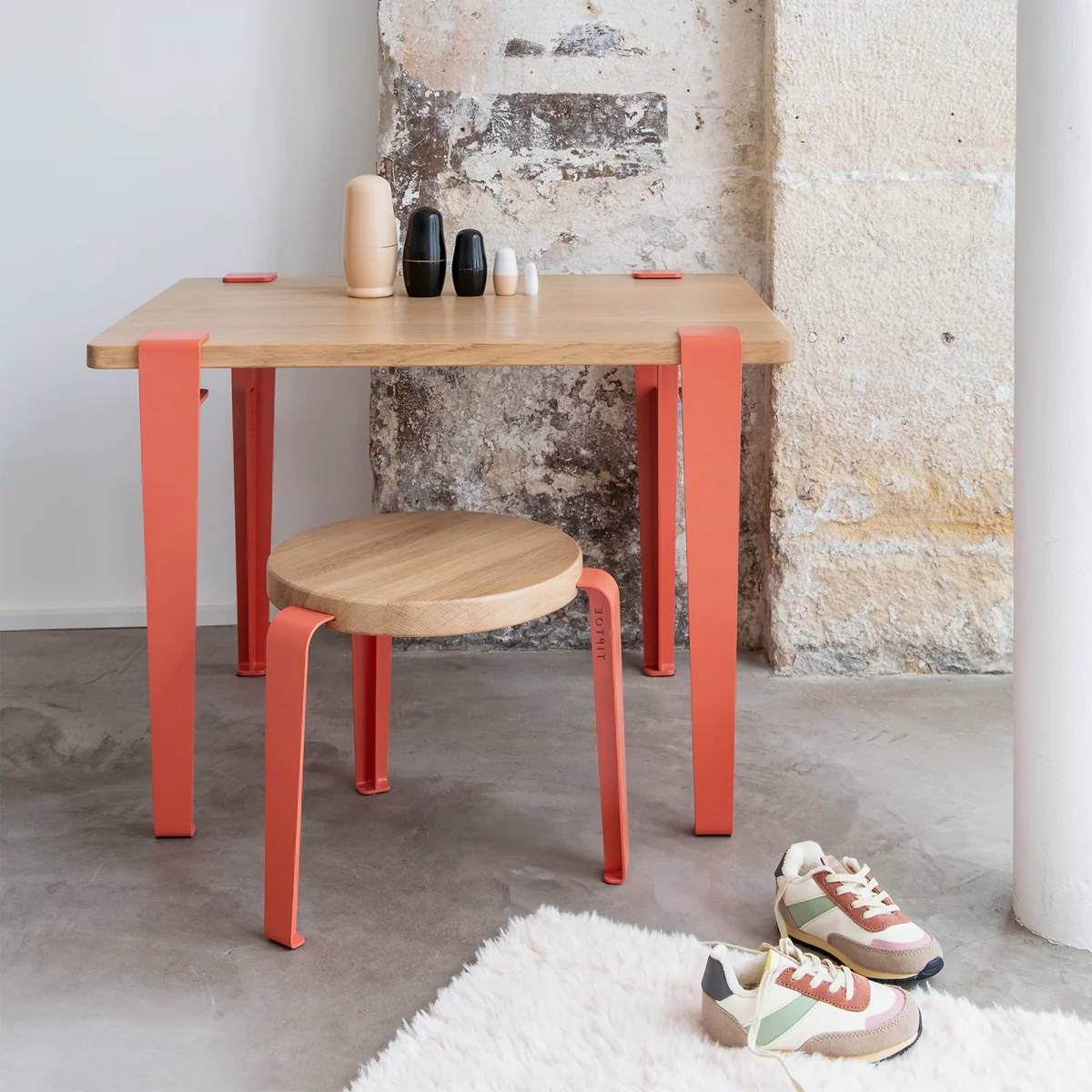 MINI LOUs Sitzfläche wird aus OEKO-zertifizierter, massiver Eiche aus nachhaltig bewirtschafteten Wäldern gefertigt Die Tischbeine werden aus recycelbarem Stahl hergestellt. Der Kinderhocker kann als Sitzmöglichkeit oder Ablage für die Füße genutzt werden. Er ist in unterschiedlichen Farben erhältlich.