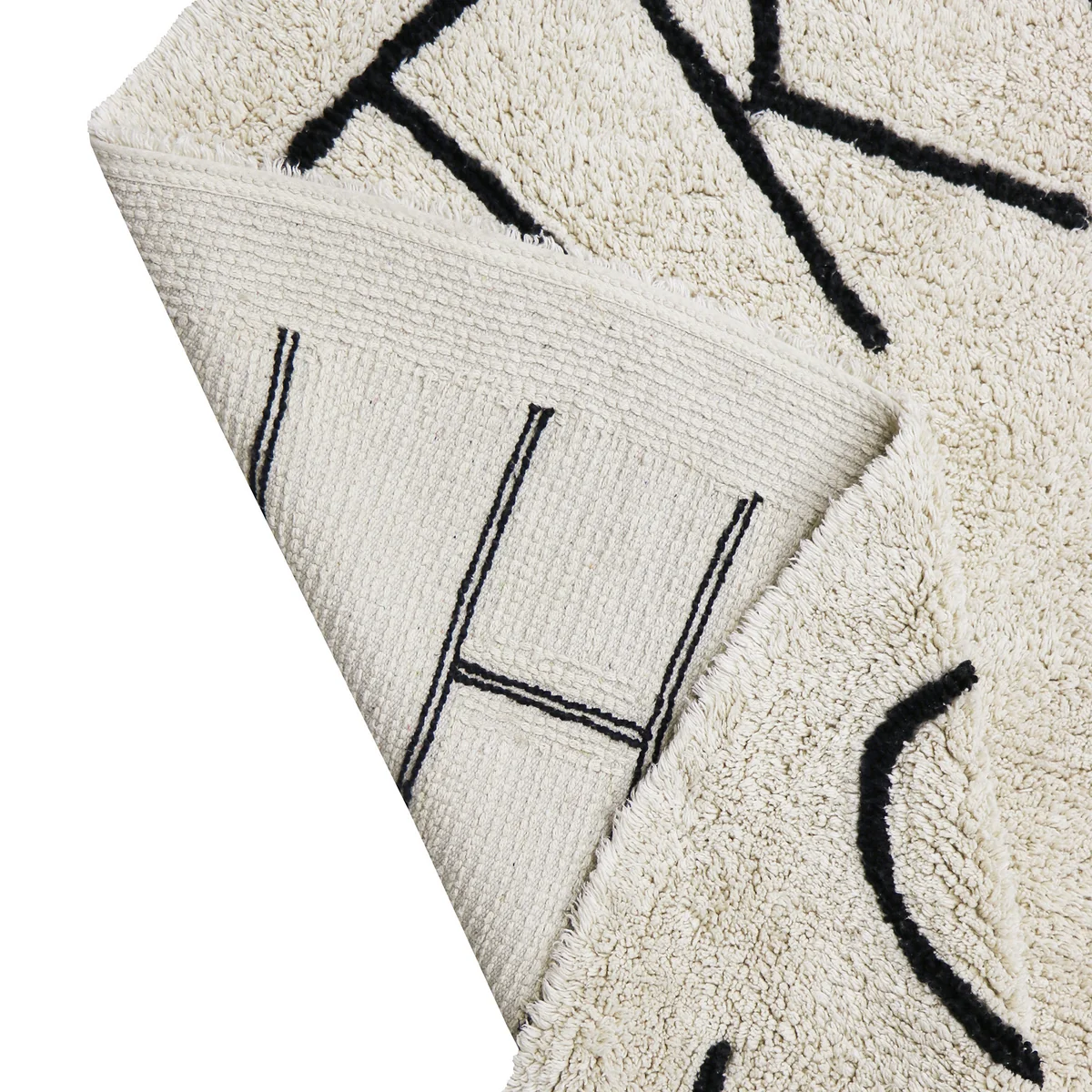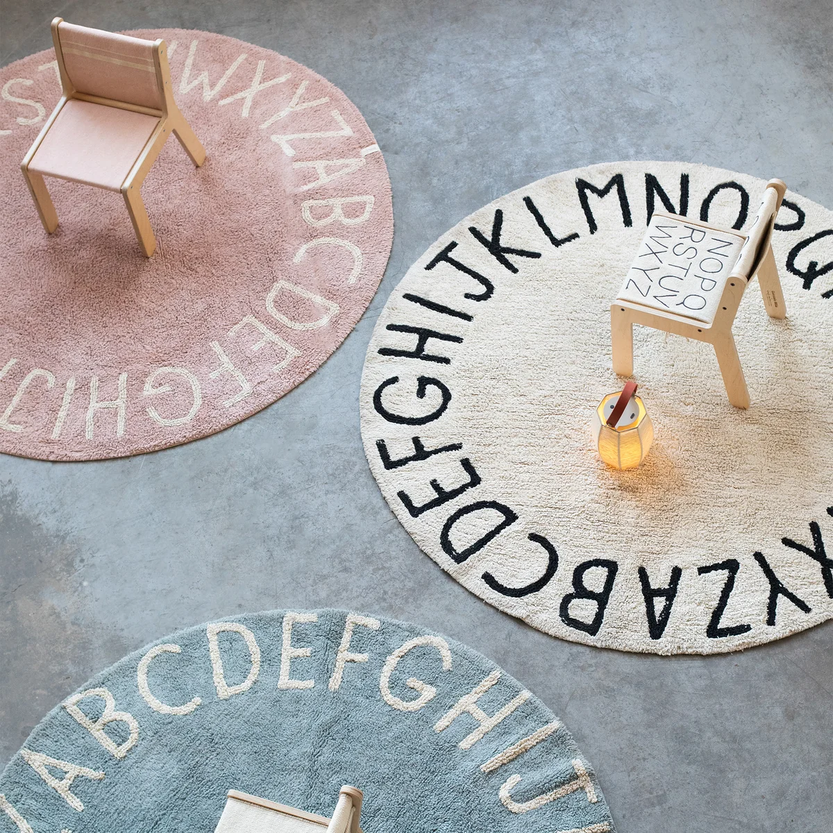Der ABC Teppich aus dem Hause Lorena Canals lädt zum Verweilen ein! Der runde Teppich ist am inneren Rand mit dem gesamten Alphabet verziert, so können sich Kinder wunderbar in die Mitte des samtigen Teppichs setzen und das ABC erlenen. Die neutralen Farbtöne des Teppichs machen ihn überaus anpassungsfähig. Er wird aus einem Materialmix aus reiner und recycelter Baumwolle gefertigt.
